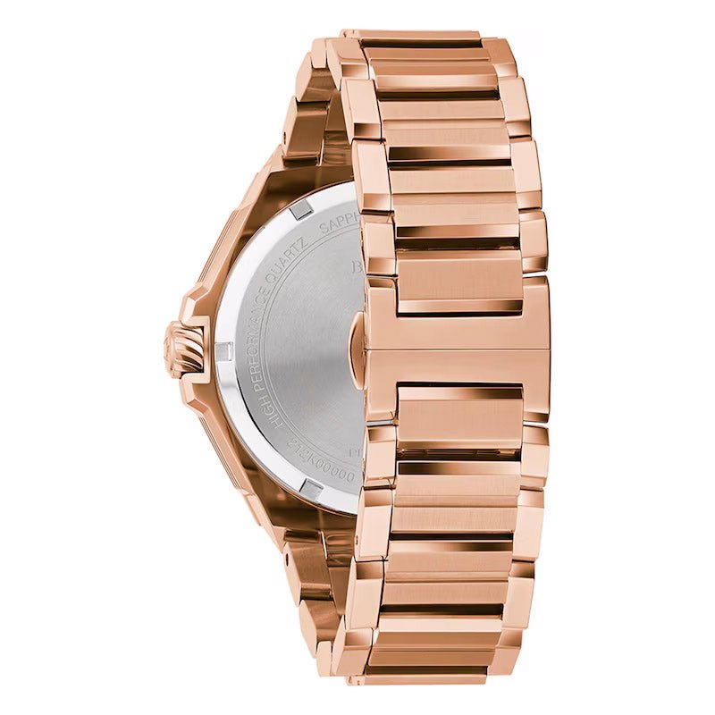 Die Series X steht für unübertroffene Präzision dank Bulovas eigenem 262-kHz-Hochleistungsquarzwerk. Dieses Modell besticht durch ein roségoldfarbenes Edelstahlarmband und ein markantes schwarzes Zifferblatt mit acht handgefassten Diamanten, die ihm ein einzigartiges und unverwechselbares Aussehen verleihen. Das Zifferblatt verfügt über eine offene Datumsanzeige, die die Hälfte der Datumsscheibe freigibt, sowie über weitere Merkmale wie gewölbtes Saphirglas, ein Datumsfenster und Wasserdichtigkeit bis 100 Meter.