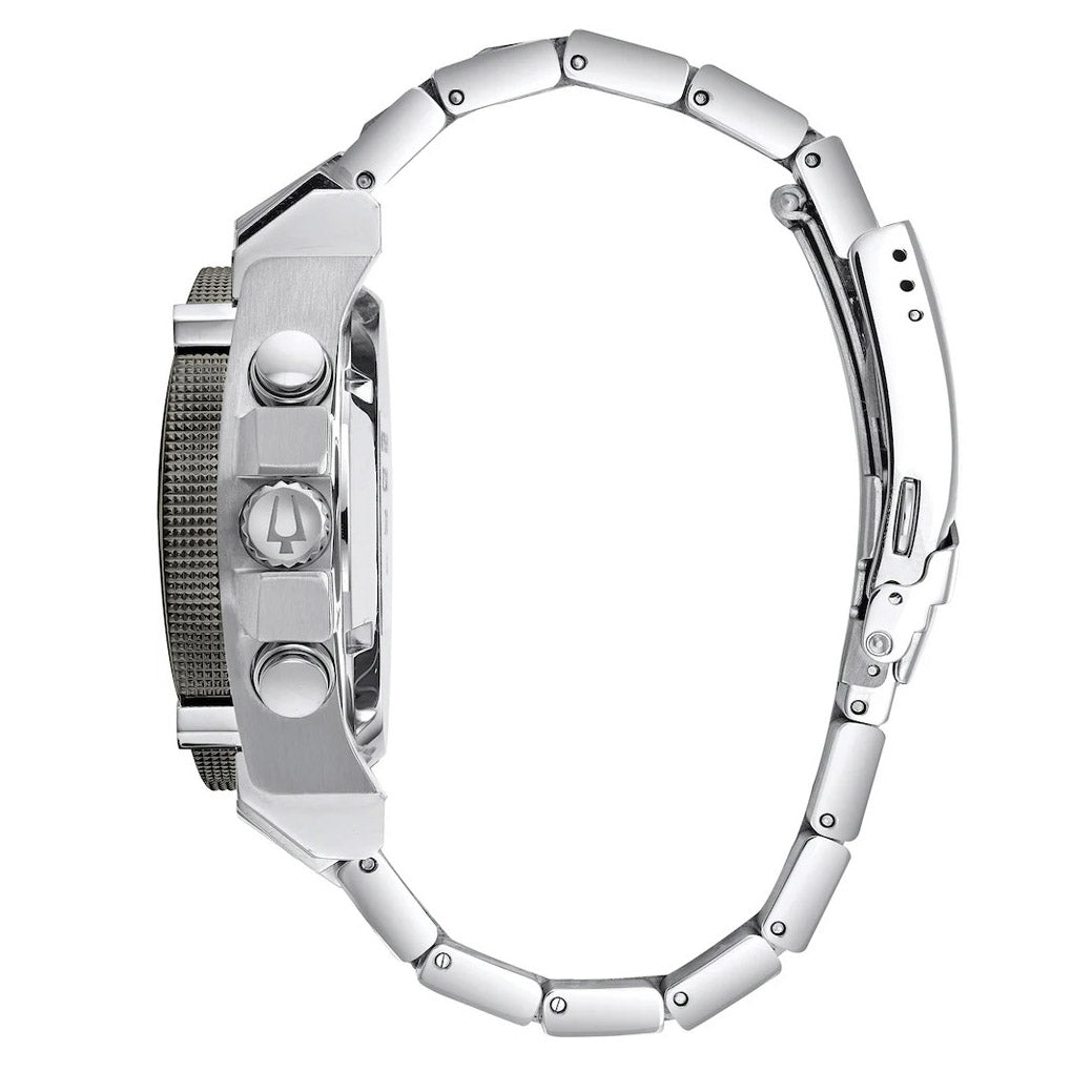 Diese Herrenuhr nutzt die Kraft des von Bulova entwickelten Acht-Zeiger-Quarzchronographenwerks, das für seine außergewöhnliche Genauigkeit mit einer Schwingungsfrequenz von 262 kHz bekannt ist – achtmal höher als bei Standarduhren. Das Gehäuse aus Edelstahl mit grauer Ionenplattierung, verschraubtem Gehäuseboden und verschraubter Krone besticht durch ein markantes schwarzes Zifferblatt aus Kohlefaser mit Datumsanzeige. Weitere Merkmale sind ein gewölbtes Mineralglas für erhöhte Widerstandsfähigkeit, ein Edelstahlarmband mit sicherer Faltschließe, Sicherheitssteg und Verlängerung. Mit einer Wasserdichtigkeit bis 300 Meter vereint diese Uhr Präzision, Stil und robuste Funktionalität für vielseitige Einsatzmöglichkeiten in jeder Situation.