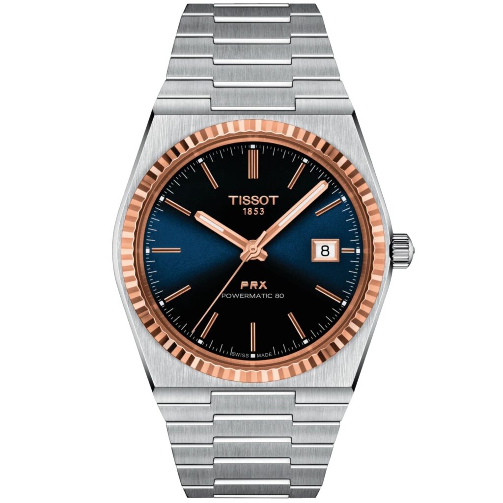 An automatic watch is powered by the energy of the person who wears it. Wrist movement enables the mechanism to run. The Powermatic 80 movement boasts 80 hours of power reserve, which is enough to continue telling time accurately even if the watch is not worn for three days. All of this watchmaking excellence can be viewed through the sapphire crystal watch back. It is an innovative movement that outperforms the competition, whose movements generally provides 36 hours of power reserve. Ensuring good visibility under all conditions is an important goal for Tissot. This is why some of their timepieces feature a material called Super Luminova®. This material is placed on visible parts such as dials and hands, where it functions as a miniature accumulator of reflected light when the watch finds itself in the dark. This model boasts an extra touch of sophistication by sporting an18ct. Rose Gold fluted bezel to compliment the baton hour markers and vivid blue dial.