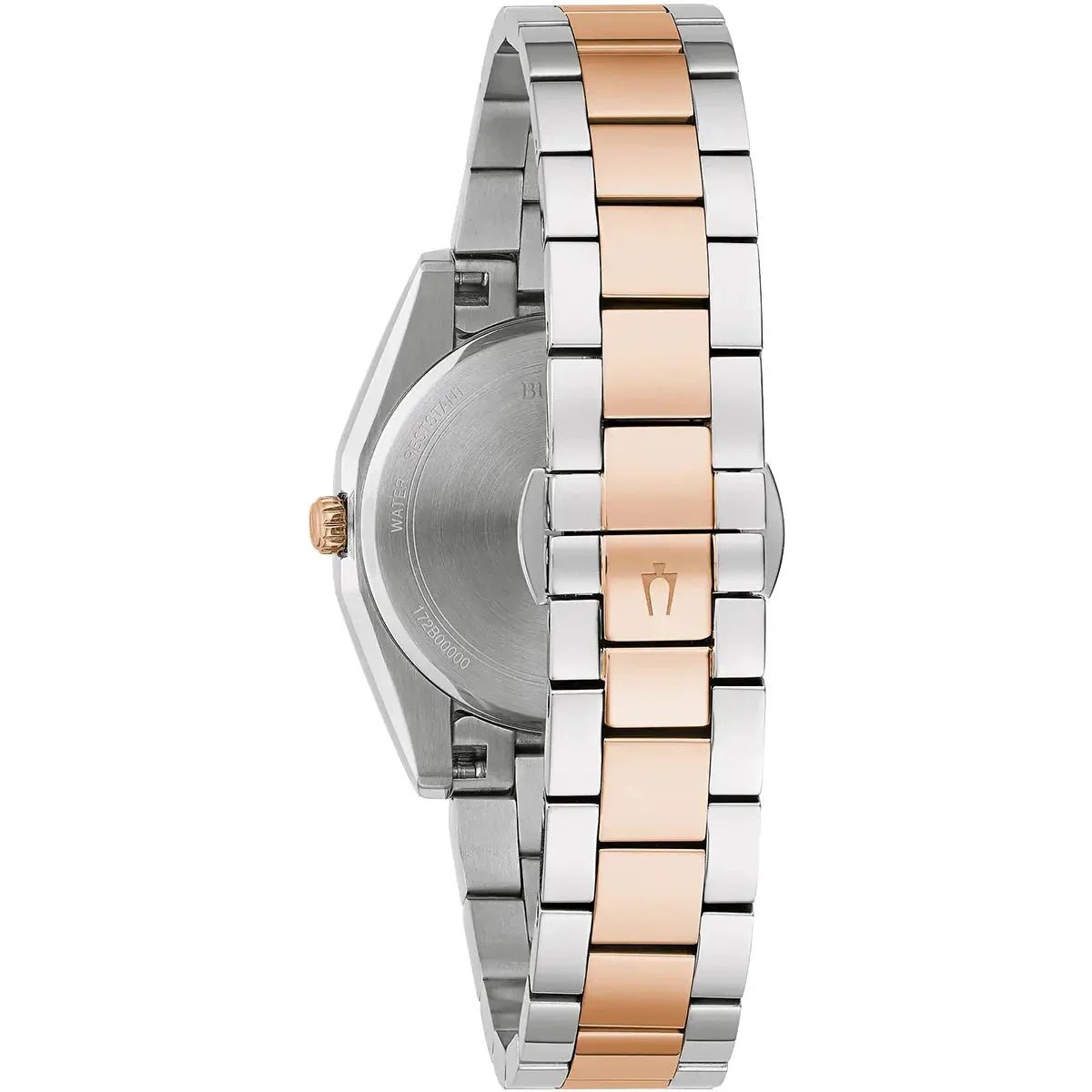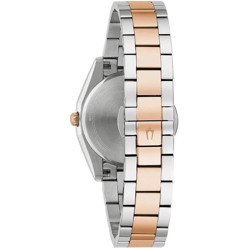 La classica collezione Surveyor di Bulova si rinnova con un orologio sportivo da donna. Questo segnatempo bicolore, nei toni dell'oro rosa e dell'argento, presenta una cassa e un bracciale in acciaio inossidabile dal tocco elegante. Il quadrante in madreperla bianca è impreziosito da 11 diamanti incastonati a mano, per un look femminile. Ricco di dettagli raffinati, questo orologio rappresenta un'aggiunta di classe a qualsiasi collezione.