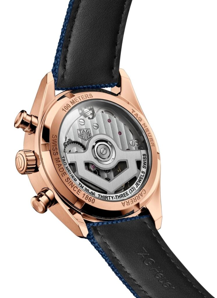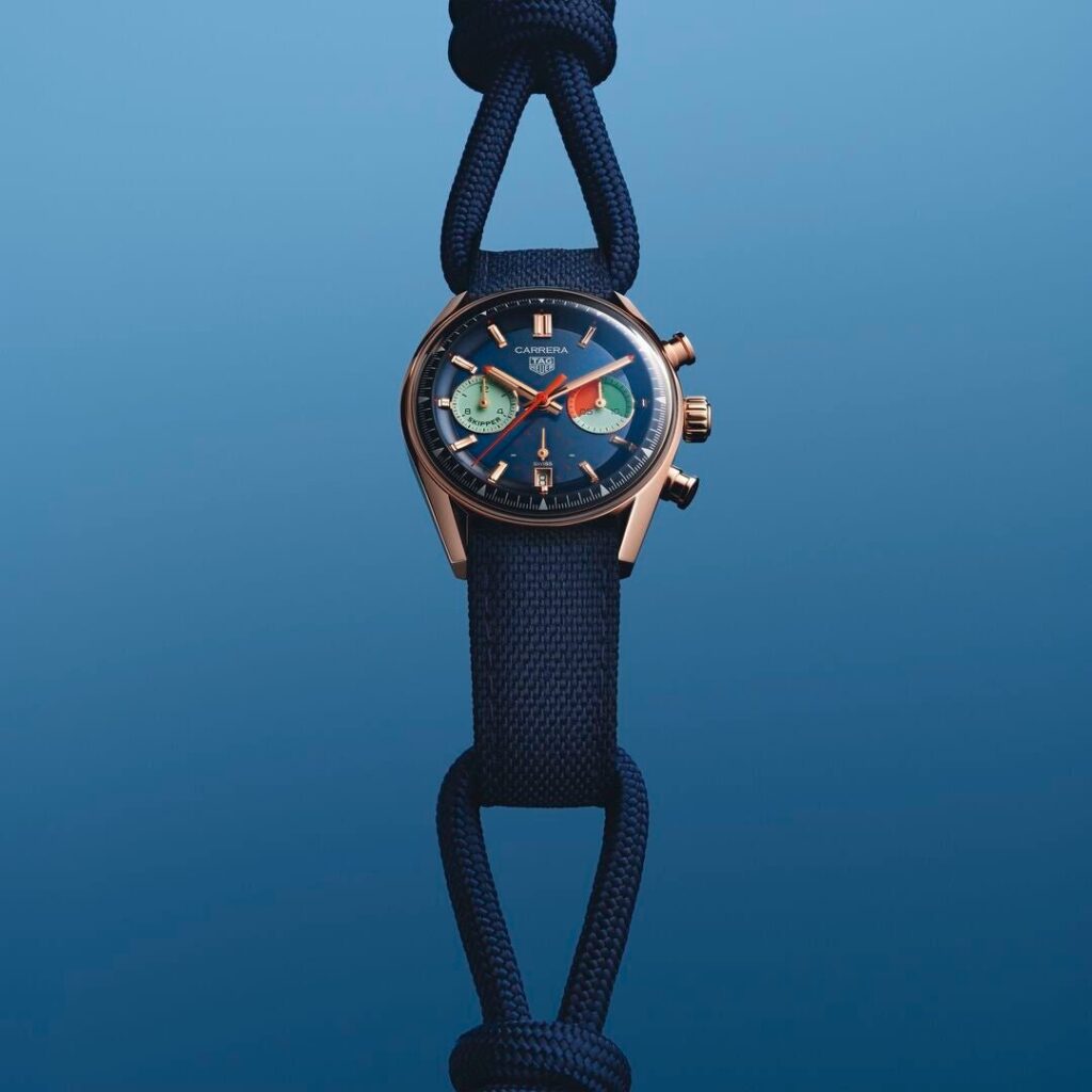 L'unico scopo della funzione cronometro per regate sull'orologio TAG Heuer Skipper originale era quello di assistere alla partenza della gara. Si tratta di una complicazione ancora utilizzata oggi, da qui l'importanza del nuovo Carrera Skipper Chronograph del 2024, impreziosito da una splendida e lussuosa cassa in oro rosa 18 carati. Il TAG Heuer Carrera Skipper referenza CBS2241.FN8023 è un modello da 39 mm, con cassa in oro rosso massiccio, impermeabilità fino a 100 metri, vetro zaffiro e calibro meccanico TH20-06 con riserva di carica di 80 ore. Gli esperti di TAG Heuer hanno dotato il Carrera Skipper di un elegante cinturino in tessuto blu e hanno messo in mostra il movimento, completo di rotore a forma di scudo Heuer, attraverso il fondello in vetro zaffiro.