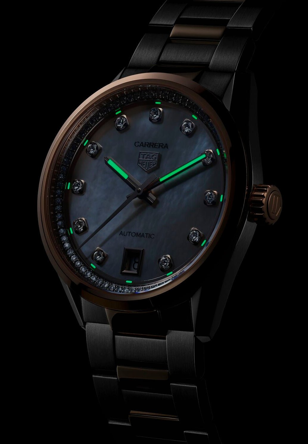 The lady’s TAG Heuer Aquaracer watch reference WBN2351.BD0000 features a date window at 6 o’clock trimmed in rose gold tones, along with rose gold set diamond hour markers and hands that have been treated with Super LumiNova. This watch is powered by the automatic Calibre 7, complete with a 56 hour power reserve and measures a diameter of 36mm on the female wrist. The watch completes its elegant look with a rose gold and stainless steel H shaped bracelet with a TAG Heuer engraved logo for a secure and comfortable fit.