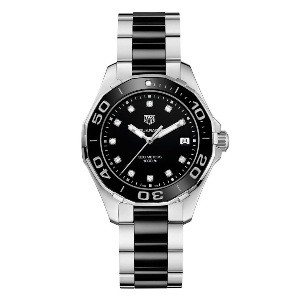 タグ・ホイヤー アクアレーサー WAY131C.BA0913 レディース ダイヤモンド ダイバー ウォッチは、ラグジュアリーと冒険のエッセンスを完璧に体現しています。この精巧なタイムピースは、光沢のあるブラックの文字盤に11個のダイヤモンドのアワーマーカーがエレガントにあしらわれ、洗練された輝きで時計の魅力をさらに高めています。文字盤には蓄光塗料が施された針とマーカーが採用されており、昼間の着用から水中探検まで、あらゆる状況下で優れた視認性を確保します。