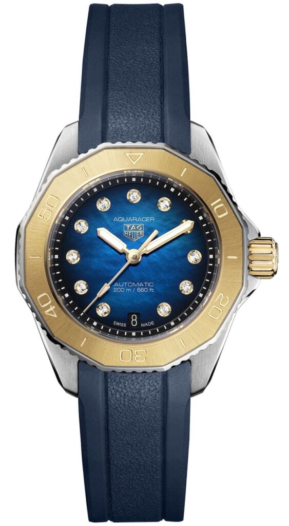 タグ・ホイヤー アクアレーサー プロフェッショナル 200 オートマチック(WBP2450.FT6215)は、ラグジュアリーと機能性を兼ね備えた、目を引くレディースダイバーズウォッチです。40mmのステンレススチールケースは、ゴールドメッキのベゼルでさらに引き立てられ、洗練されたディープブルーのサンレイ仕上げの文字盤を完璧に際立たせています。ダイヤモンドがセットされたアワーマーカーは明るく輝き、堅牢で冒険心あふれるデザインにエレガントなタッチを加えています。自動巻きムーブメントを搭載し、信頼性と精度を実現。ブルーのラバーストラップは快適性と耐久性を確保し、普段使いはもちろん、冒険的な外出にも最適です。200m防水のこのアクアレーサーは、ラグジュアリーな美しさとスポーティな機能を完璧に融合させ、ダイバーはもちろん、スタイリッシュな装いを好む方にも理想的な一本です。