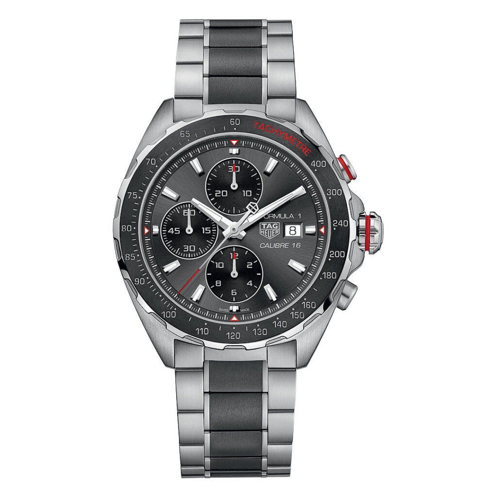 印象的なアンスラサイトカラーのサンレイダイヤルには、スーパールミノバコーティングされた時針と分針、3つのブラッククロノグラフカウンター、赤い先端のセンターセコンド針、3時位置の日付表示窓など、細部にまでこだわったデザインが施されています。これらの便利な機能はすべて、特別なチェッカー模様の彫刻が施された円形の細かいブラッシュ仕上げのねじ込み式ケースバックの裏側に隠されたタグ・ホイヤー キャリバー16ムーブメントによって駆動されます。この印象的なスイス製キャリバーは、21石のルビー、毎時28,800振動のテンプ振動数、42時間のパワーリザーブを誇ります。このタグ・ホイヤー フォーミュラ1 ウォッチの外観を完成させるために、スタイリッシュなツートーンのステンレススチールとセラミックのブレスレットが付属し、レーシングスーツの上から装着できるように特別に設計されたエクステンション付きのフォールディングクラスプが備えられています。