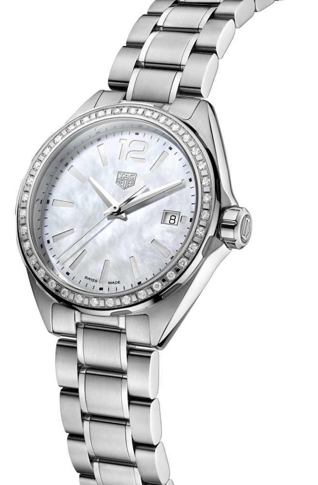 一目でそれとわかる、魅惑的なホワイトマザーオブパールダイヤルが特徴的なこのタグ・ホイヤー フォーミュラ1 レディースウォッチは、12時位置にブランドの象徴的なロゴ、ロジウムメッキのインデックス、そして洗練されたスチール製の針を備えています。ダイヤモンドがあしらわれた32mmのステンレススチールケースは100m防水で、洗練されたラグと上品なステンレススチール製ブレスレットにより、手首に美しくフィットします。内部にはスイス製のクォーツムーブメントが搭載されており、時、分、秒表示に加え、3時位置に便利な日付表示窓、そして電池残量表示機能も備えています。このタグ・ホイヤー フォーミュラ1 レディースウォッチは、常にアクティブな女性のためにデザインされた、華やかさと機能性を兼ね備えたタイムピースを提供するブランドの優れた例と言えるでしょう。