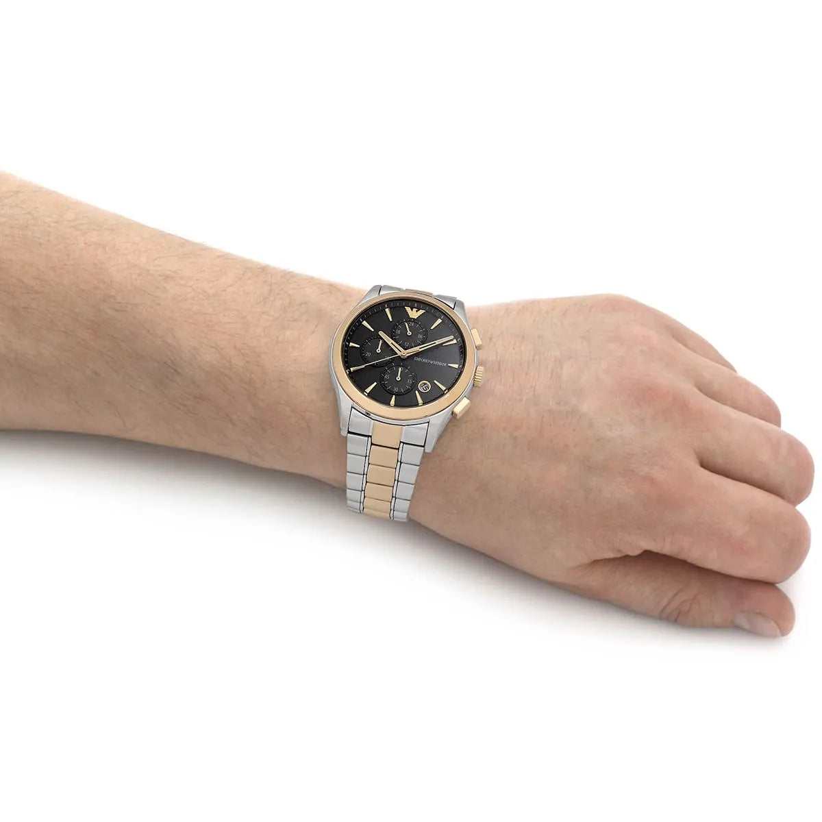 The signature Giorgio Armani Eagle logo is situated at the 12 o clock position in gold and the signature Emporio Armani logo is printed at the 3 o clock position in white. A stainless steel brushed silver and gold bracelet with a butterfly clasp fastening. Water resistance of 50m. Comes in a branded gift box.