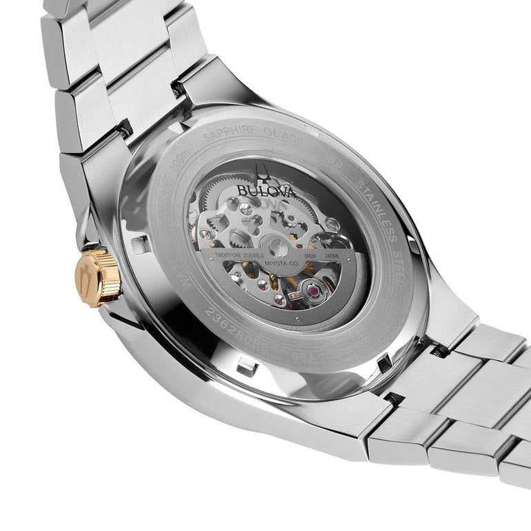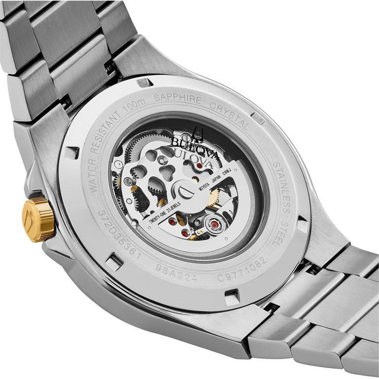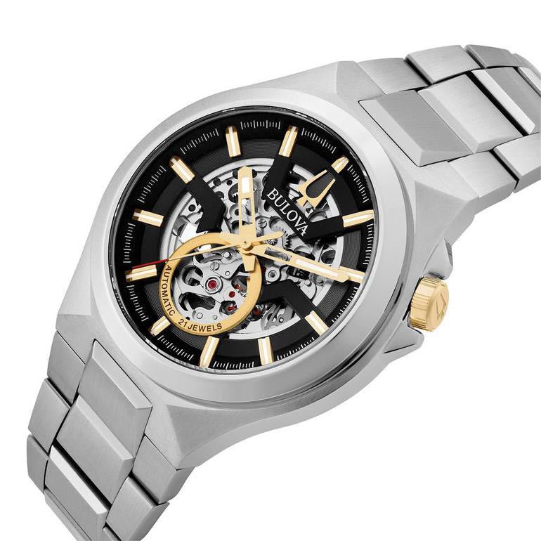 Dit horloge uit de Classic Collection straalt tijdloze elegantie uit. De roestvrijstalen kast met goudkleurige kroon en de open zwarte wijzerplaat zijn voorzien van goudkleurige accenten, lichtgevende wijzers en indexen voor optimale leesbaarheid in alle lichtomstandigheden. Het horloge wordt aangedreven door een automatisch uurwerk, beschermd door krasbestendig saffierglas, een roestvrijstalen armband en is waterdicht tot 100 meter.