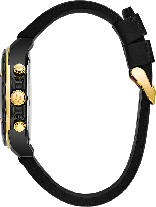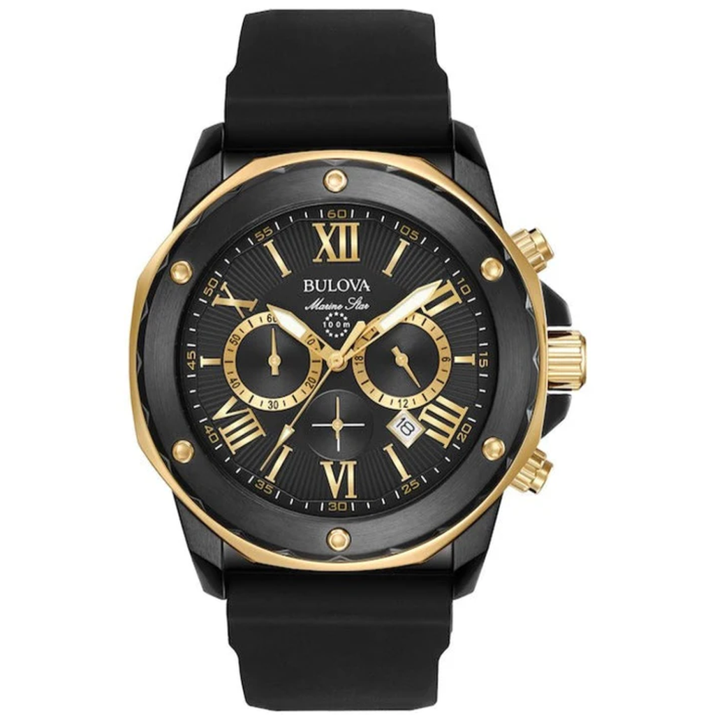 Dit herenhorloge met chronograaf uit de Marine Star-collectie van Bulova heeft een zwarte wijzerplaat met geelgouden accenten, drie subwijzerplaten voor de tijdsaanduiding en een datumvenster in een zwarte, ion-geplateerde roestvrijstalen kast. De kast wordt afgedekt door mineraalglas en de zwarte siliconen band wordt vastgemaakt met een gesp. Het horloge is voorzien van een quartz chronograaf uurwerk en is waterdicht tot 100 meter.