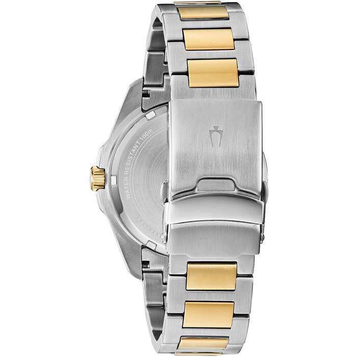 From the Bulova Marine star Collection. This men’s timepiece features a two-tone case and bracelet with a blue dial featuring a date window at the three o’clock position. Watch features flat mineral crystal, quartz movement and water resistance to 100 metres.