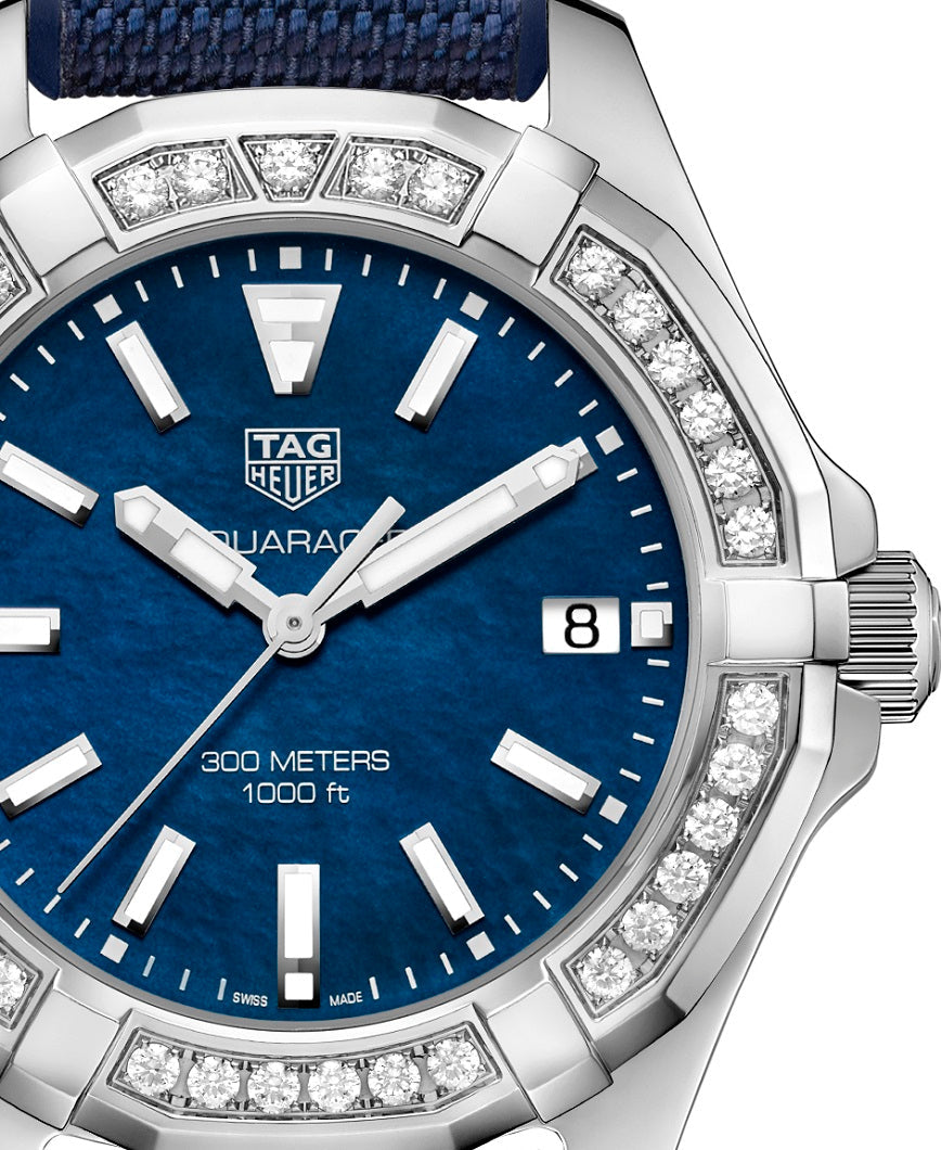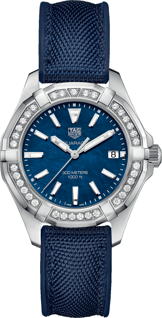 TAG Heuer Aquaracer Quartz horloge van 35 mm. Modelreferentie: WAY131N.FT6091. Roestvrijstalen kast bezet met diamanten. Blauwe parelmoeren wijzerplaat. Quartz uurwerk. Blauwe stoffen band met rubberen binnenvoering. Zwitsers gemaakt. Het horloge wordt geleverd in de originele verpakking, met documentatie en 2 jaar garantie.