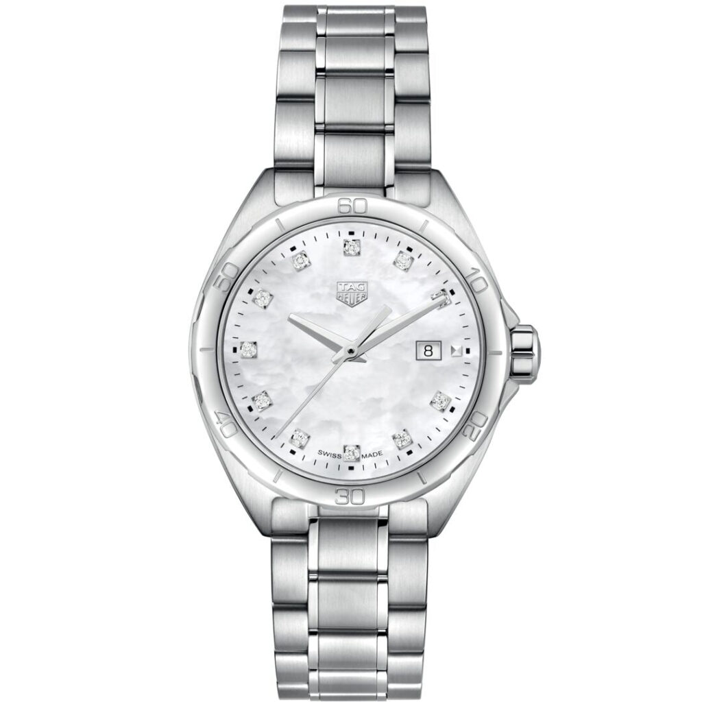 Zilverkleurige wijzers en een zilverkleurig, handgepolijst TAG HEUER-schild versterken de lichtgevende eigenschappen van de parelmoeren wijzerplaat. Stijlvol en chic, maar tegelijkertijd gericht op prestaties: waterdichtheid gegarandeerd tot 100 meter.