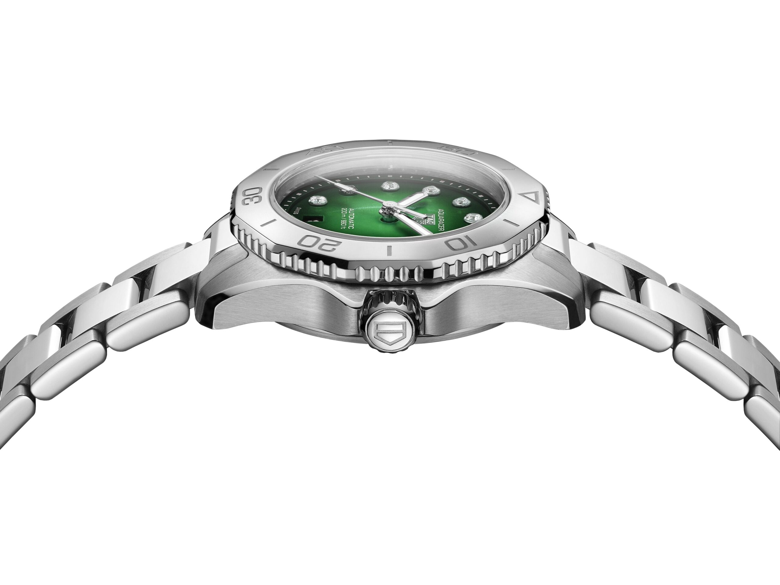 Maak kennis met de elegante TAG Heuer Aquaracer Professional 200 WBP2415.BA0622 , een perfecte combinatie van luxe en prestatie voor de moderne vrouw. Dit opvallende horloge heeft een levendige smaragdgroene wijzerplaat met 11 schitterende diamanten als uurmarkeringen, die een verfijnde touch geven aan het sportieve design. De 36 mm roestvrijstalen kast is zowel duurzaam als comfortabel om dagelijks te dragen. De unidirectioneel draaibare bezel zorgt voor functionaliteit tijdens het duiken, terwijl het Zwitserse automatische uurwerk betrouwbaarheid garandeert. Waterdicht tot 200 meter, is dit horloge ideaal voor vrouwen die een chique stijl waarderen die bestand is tegen de avonturen van het dagelijks leven. Met zijn klassieke roestvrijstalen armband en verfijnde esthetiek is deze TAG Heuer Aquaracer ontworpen voor vrouwen die een actief maar toch elegant horloge wensen.