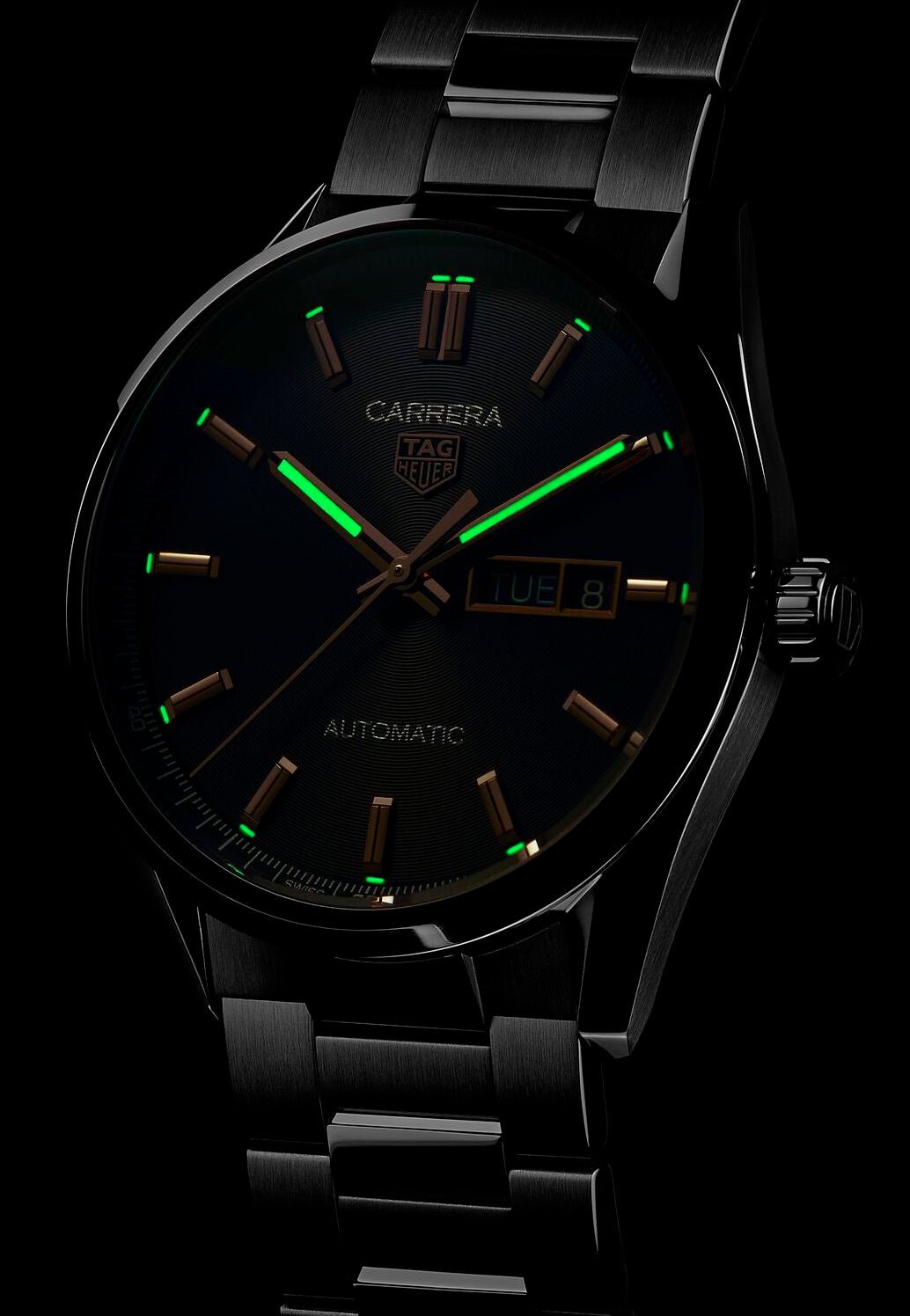 TAG Heuer staat bekend om zijn uiterst nauwkeurige en krachtige uurwerken en heeft dit TAG Heuer Carrera-horloge uitgerust met een van zijn beroemde Zwitserse automatische kalibers. Het automatische Calibre 5-uurwerk brengt de uren, minuten en seconden tot leven, evenals een dubbele dag- en datumweergave op 3 uur op een betoverende zwarte wijzerplaat met concentrisch patroon. De functies worden weergegeven met slanke, roségoudkleurige wijzers met witte Superluminova-inlays en bijpassende roségoudkleurige indexen. De wijzerplaat wordt beschermd door een laag saffierglas, bekend om zijn krasbestendigheid en scherpe leesbaarheid, in een 41 mm roestvrijstalen kast met een transparante achterkant. Voor een laatste vleugje verfijning is dit TAG Heuer Carrera-horloge voor heren voorzien van een H-vormige roestvrijstalen armband met een klassieke vouwsluiting.