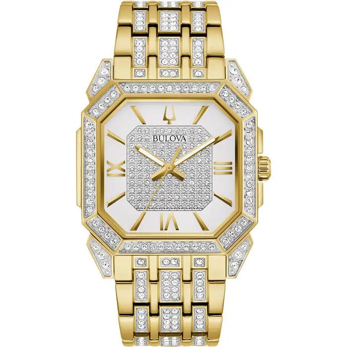 The Bulova 98A295 watch combines a 40mm square-shaped stainless steel case with a gold stainless steel bracelet. It features a white analog dial protected by mineral crystal glass. The watch is adorned with over 300 crystals on the dial, bracelet, and bezel. Powered by a quartz movement, it has splash water resistance, meaning it cannot be submerged in water.