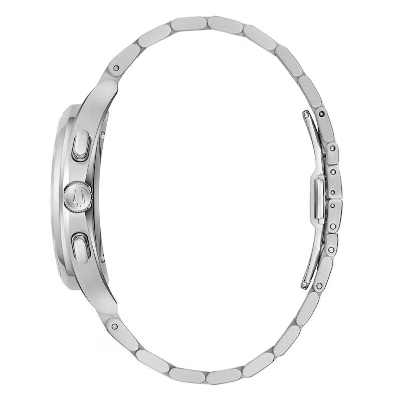 Introducing the latest from Bulova’s CURV collection for men, blending unrivaled sophistication with cutting-edge technology. This chronograph timepiece features a dynamic stainless steel case with brushed and polished finishes, crowned by a curved sapphire crystal. The vibrant green dial showcases striped patterning and a translucent ring revealing the high-precision curved chronograph movement. Stainless steel markers and hands contrast elegantly against the dial, while three sub-dials display elapsed time. With a matching stainless steel bracelet and deployment clasp, this watch reinterprets CURV’s elegant lines for a refined lifestyle.
