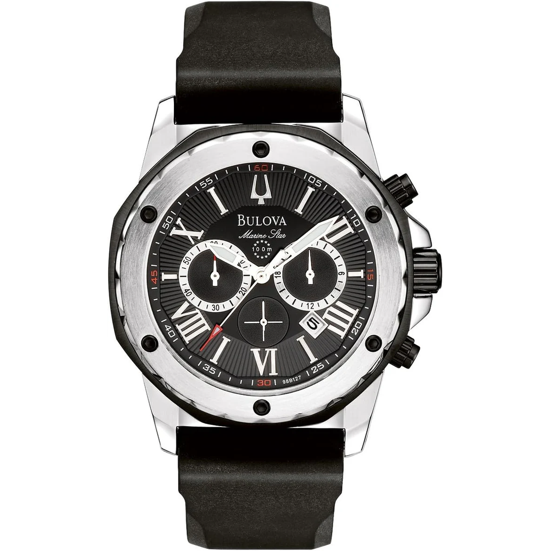 Bulova Marine Star Chronograph Black Dial Black Rubber Strap Watch For Men 98b127
