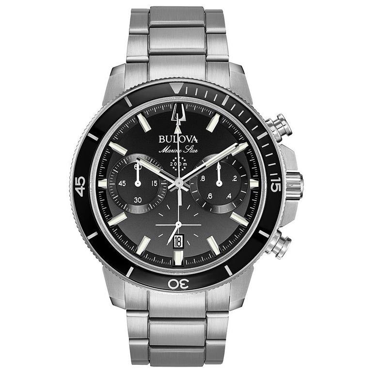 From the Marine Star Collection, this men’s six-hand chronograph exemplifies robust performance with 200-meter water resistance. The watch boasts a stainless steel case and bracelet, enhanced by a black glass insert on the rotating bezel. The black dial features luminous hands and markers for visibility in any condition. Additional features include a practical calendar function, protected by a domed mineral crystal and a screw-back case for added durability. The watch is secured with a fold-over buckle closure, complete with a safety bar and extender for a comfortable fit.