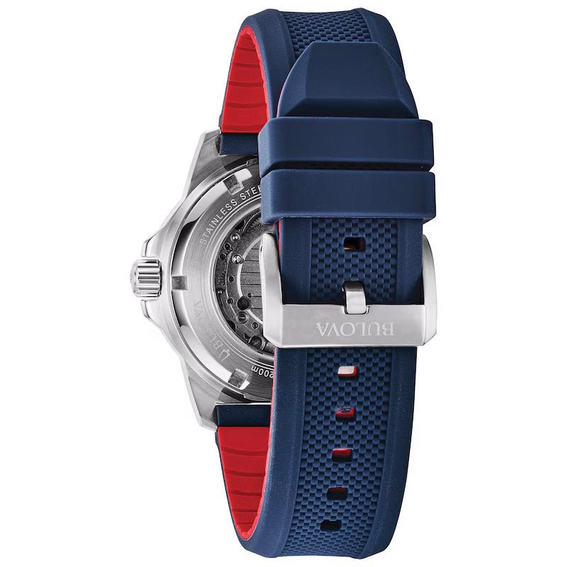Discover the Bulova Marine Star, a distinguished timepiece featuring a three-hand automatic movement displayed in an open aperture. Encased in stainless steel, it showcases a blue-rimmed outer ring that enhances its nautical-inspired design. The silver-tone and white dial is adorned with blue Roman numerals and markers, protected by a durable flat mineral crystal. Completing its modern aesthetic is a blue textured silicone strap with a striking red underside, offering both style and comfort. With water resistance up to 200 meters, this watch is crafted for versatility and reliability, making it suitable for any adventure or everyday wear.