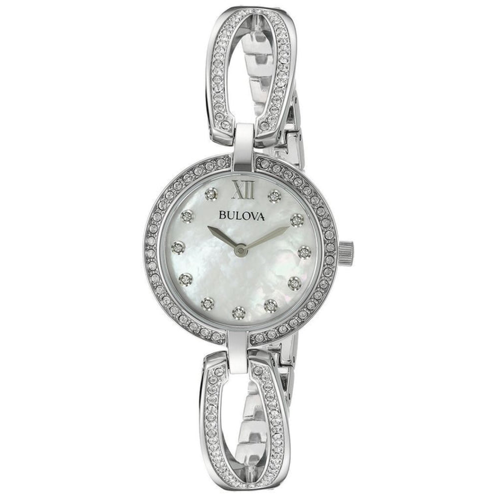 Stainless steel case with a stainless steel bracelet set with Swarovski crystals. Fixed stainless steel bezel set with Swarovski crystals. Mother of pearl dial with silver-tone hands and crystal hour markers. Roman numeral appears at the 12 o’clock positions. Dial Type: Analog. Quartz movement. Scratch resistant mineral crystal. Pull / push crown. Solid case back. Round case shape. Case size: 26 mm. Case thickness: 6.1 mm. Jewelry clasp. Water resistant at 30 meters / 100 feet. Functions: hour, minute. Dress watch style. Bulova Quartz Crystal Ladies Watch 96L223.