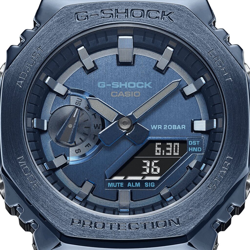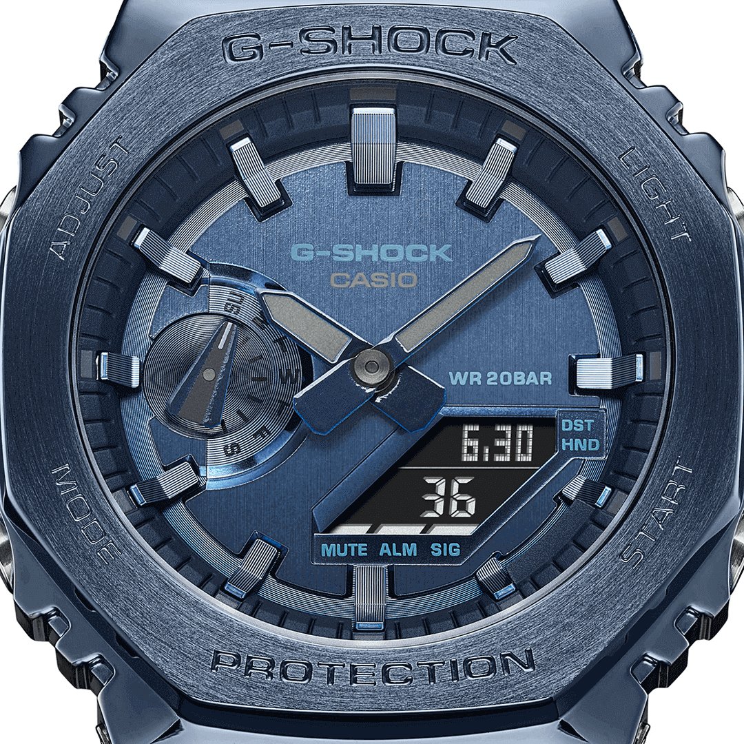 Building on the iconic 2100 octagonal shape is the new GM-2100 series, which are mid-sized G-SHOCKs with a simple yet bold design. Forged in stainless steel with rounded hairline finish, the strong bezel adds a sophisticated tone. The dial is treated with a vapour deposition finish for a meticulously detailed metallic look that suits a classic metal G-SHOCK timepiece. Still 200M water resistant with functions such as World Time, Stopwatch and a Timer.