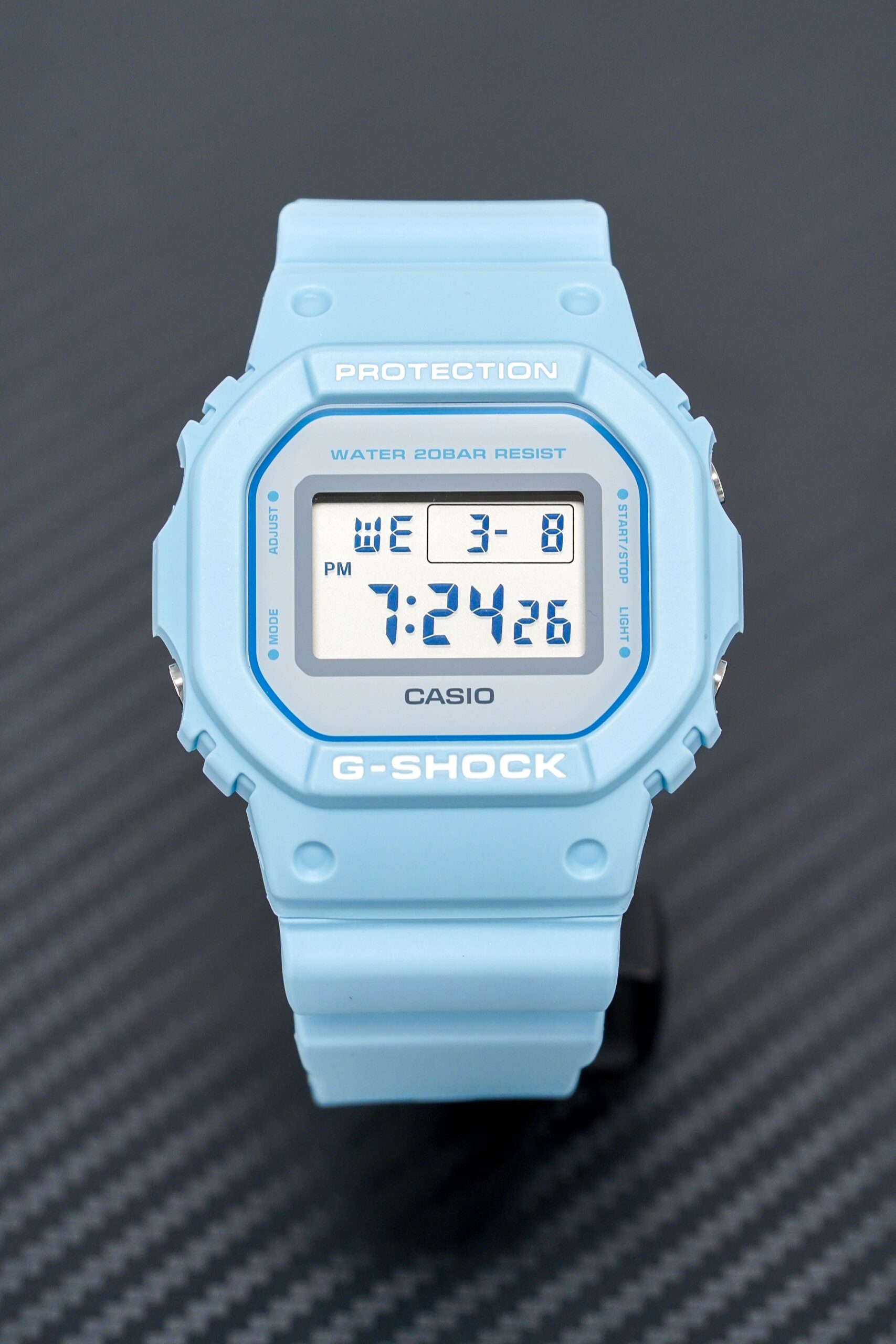 48.9mm x 42.8mm x 13.4mm Square Matte Pastel Blue Resin and Stainless Steel Case. Characteristic Shock-Proof Case with Easy to Press Button Arrangement