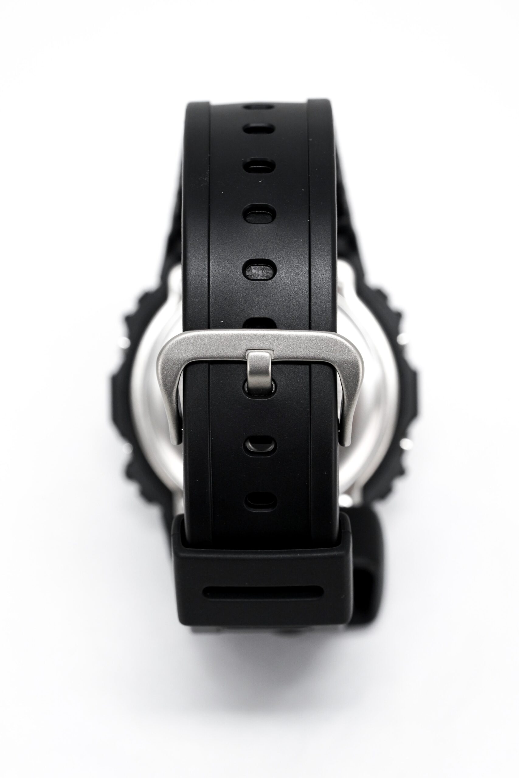 48.9mm x 42.8mm x 13.4mm Matte Black Resin and Stainless Steel Square Case. Characteristic Shock-Proof Case with Easy to Press Button Arrangement
