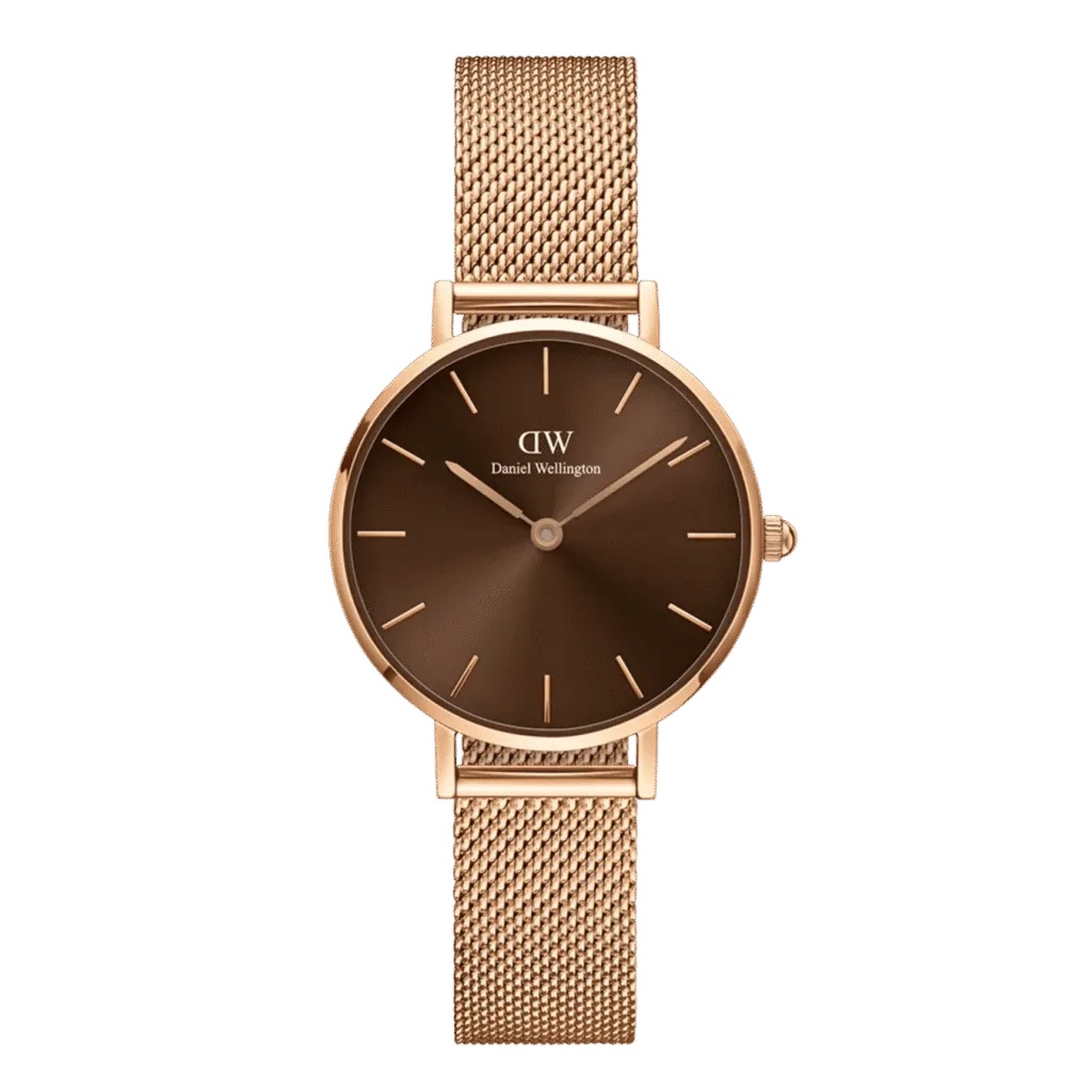 The Petite Amber features a light brown dial with a sunray finish. A vibrant colour associated with warmth, energy, and boldness. Crafted with polished stainless steel, available with a refined rose gold plating. A delicate and chic timepiece that gives your look a unique touch.Â