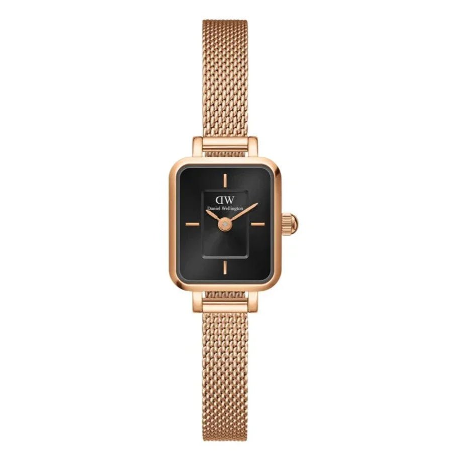 The Quadro Mini, which was created at the nexus of jewelry and watches, is a fascinating device. With two index markers for a minimalist appearance and a small Quadro dial in onyx with a sophisticated sunray finish, this is our smallest watch to date. The fabric-like mesh bracelet has the dainty charm of an elegant bracelet, but it can be switched out, giving the piece even more versatility. This watch, like the majority of our collection, is made of sturdy 316L stainless steel and has a premium rose gold plating. So, enjoy it as a beautiful piece of jewelry and wear it as a watch!