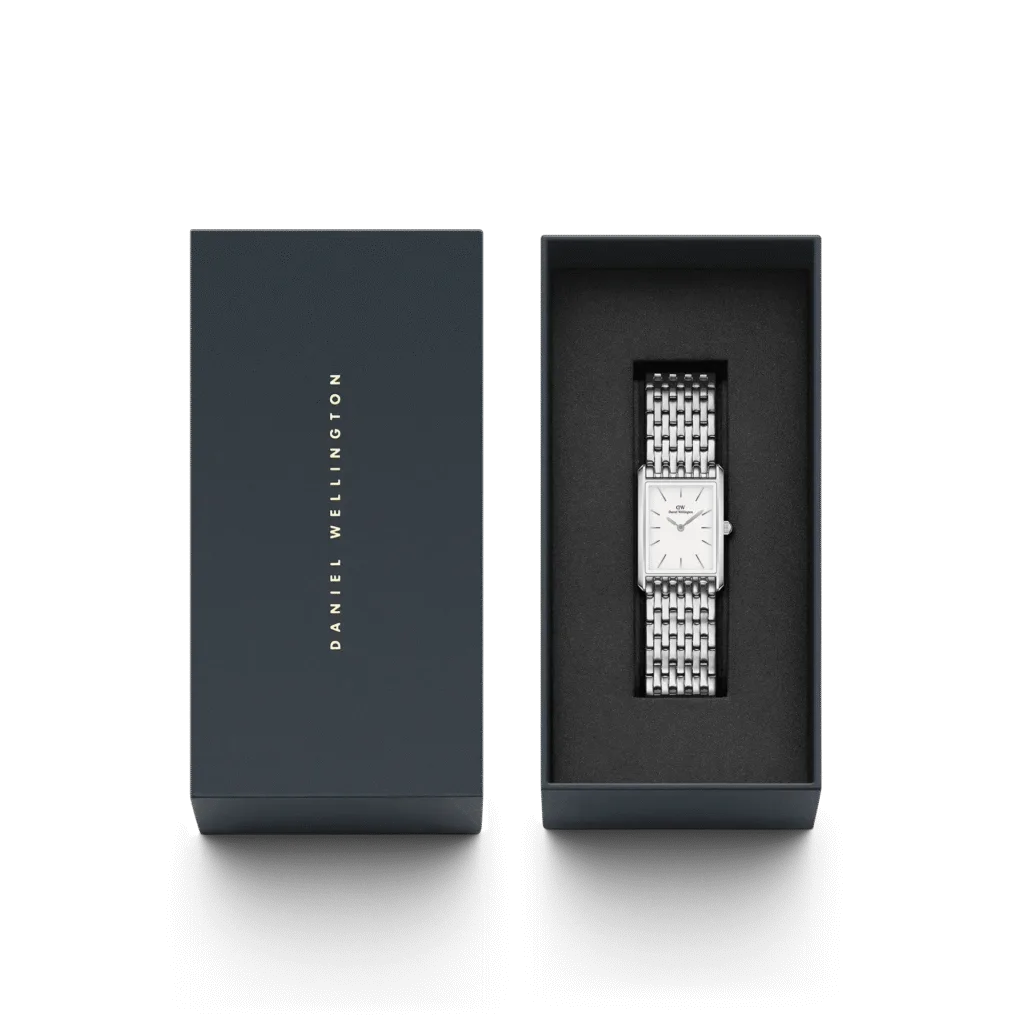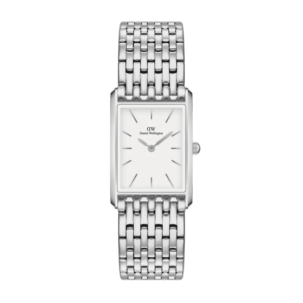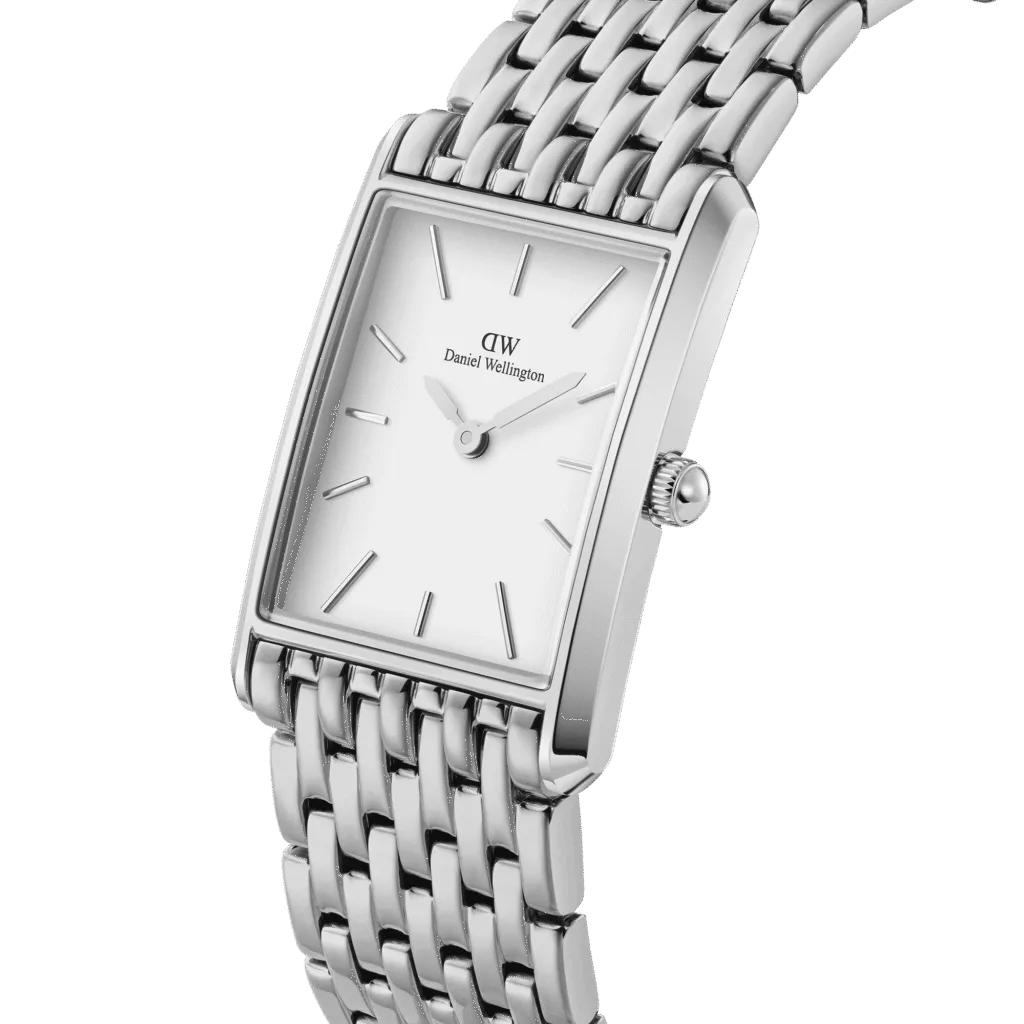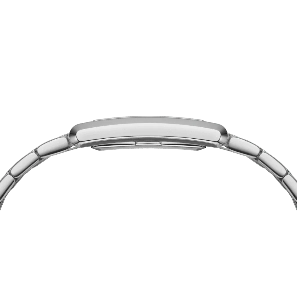 Featuring two sizes and smooth geometric edges, the Bound collection perfectly symmetry your wrist. This silver watch’s curved rectangular case and 9-link strap are precisely the same width, giving the dial a seamless integration.