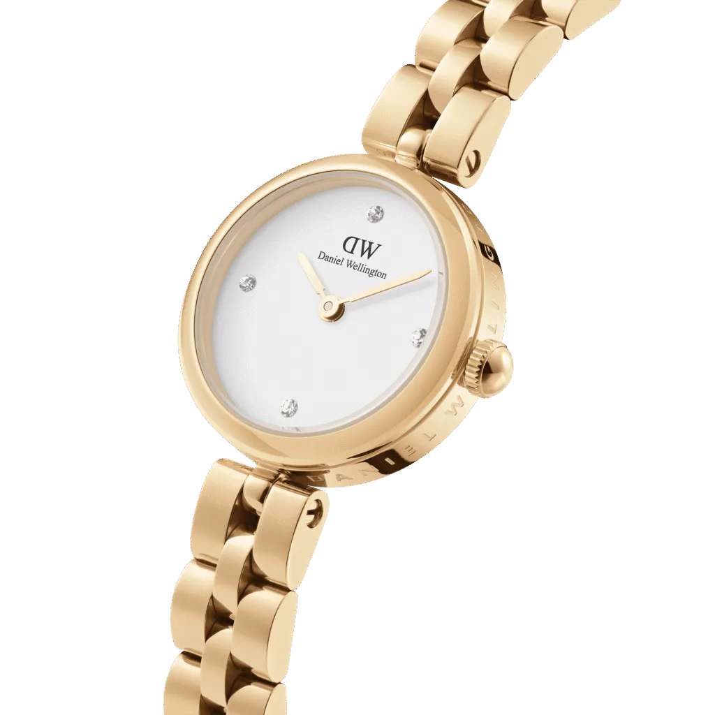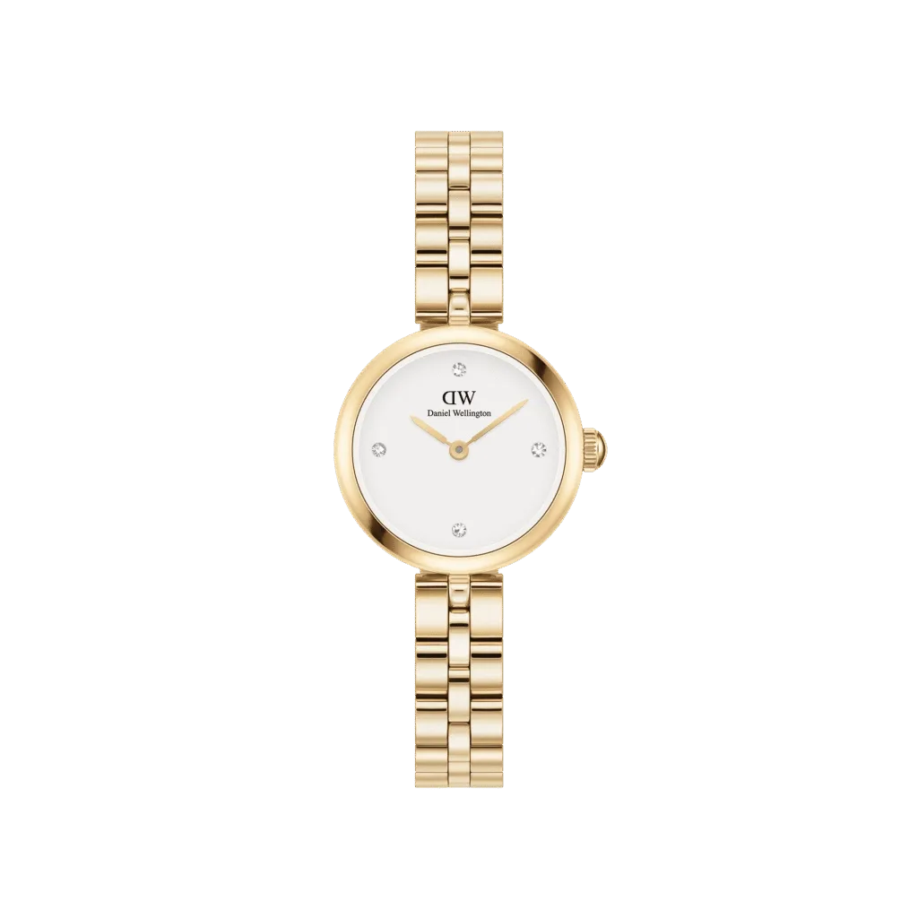 Elan Lumine, the first item to combine elements of our watch and jewelry collections, has a nameake piece’s delicate silhouette and logo design elements. has a white dial with crystals scattered across it and a gold 3-link strap.