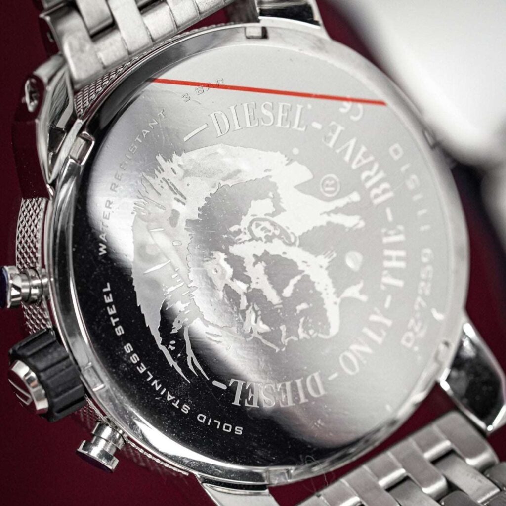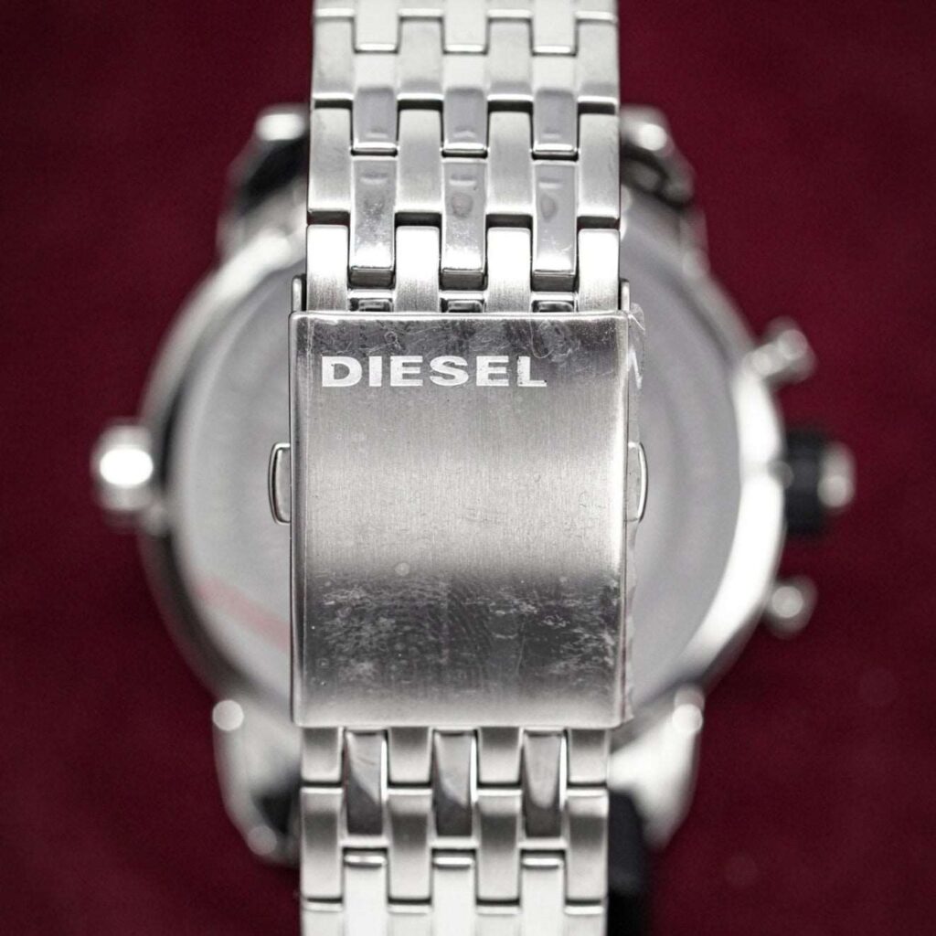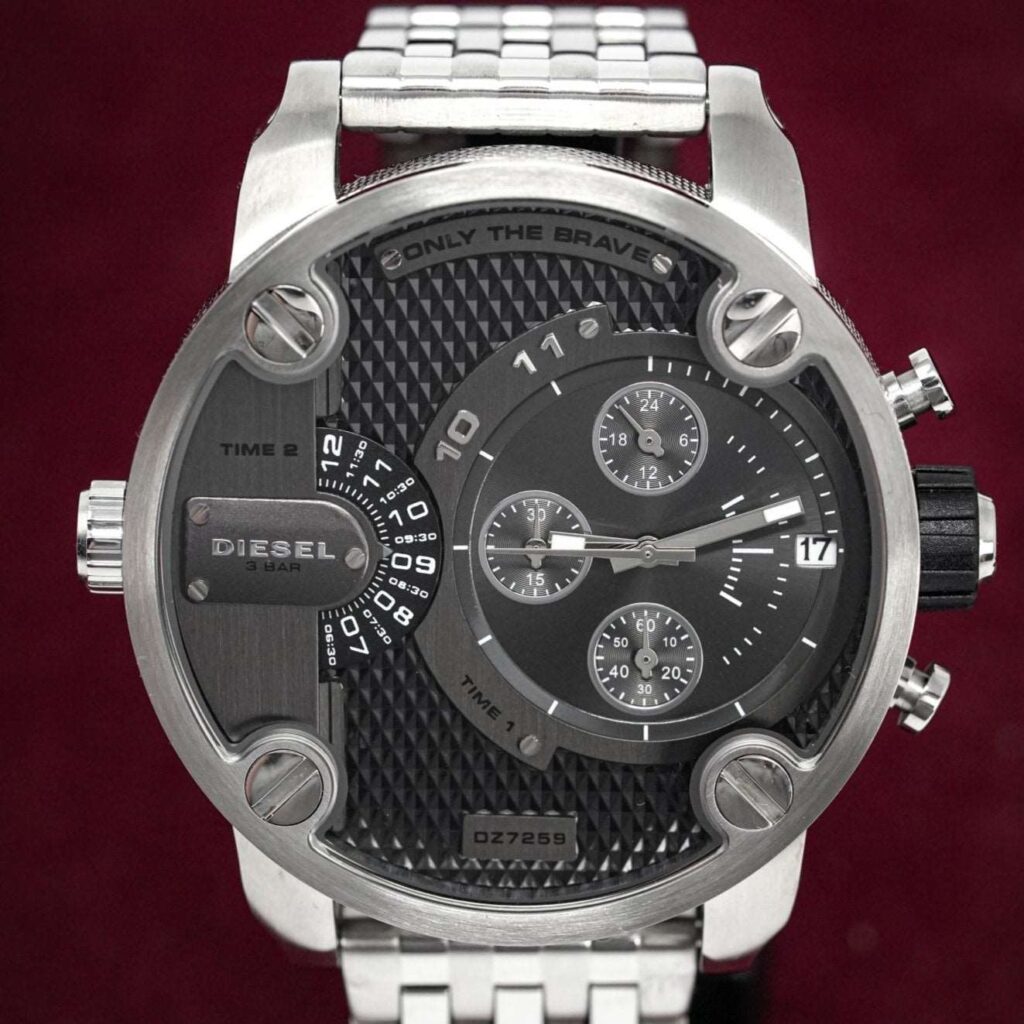 Diesel DZ7259: 51mm stainless steel case, black dial, dual time zone display, chronograph functionality, quartz movement, 30m water resistance. Bold and sophisticated design for any occasion. This striking timepiece embodies Diesel’s unique and rugged style, making it a standout accessory for both casual and formal wear.