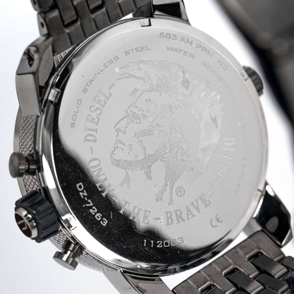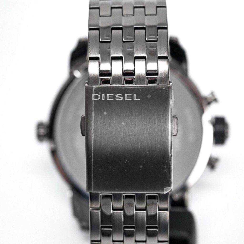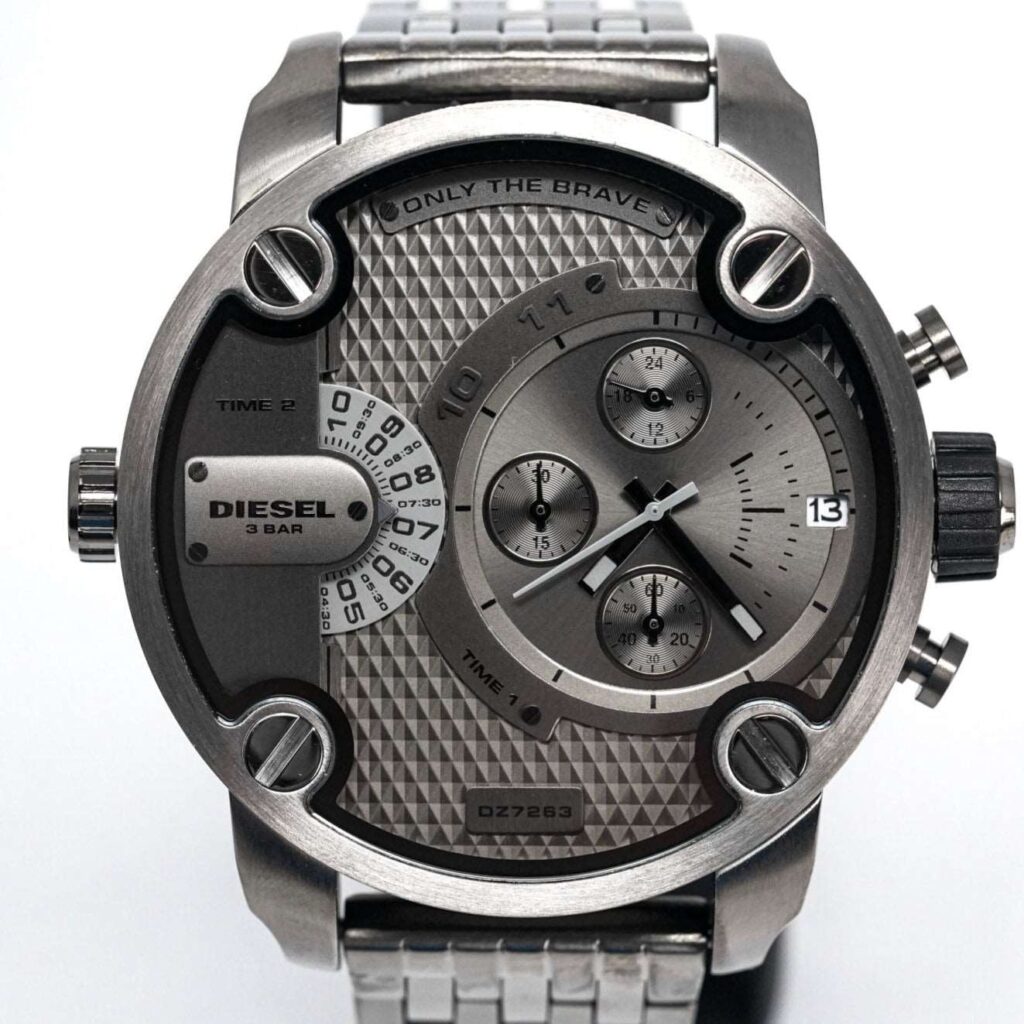 Diesel DZ7263: 51mm stainless steel case, black dial, dual time zone display, chronograph functionality, quartz movement, 30m water resistance. Bold and rugged design for any occasion. This striking timepiece embodies Diesel’s unique and robust style, making it a standout accessory for both casual and formal wear.