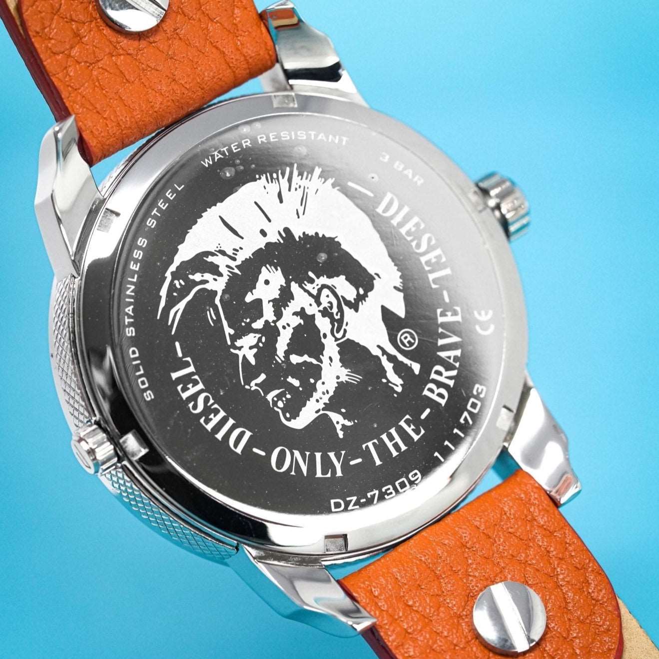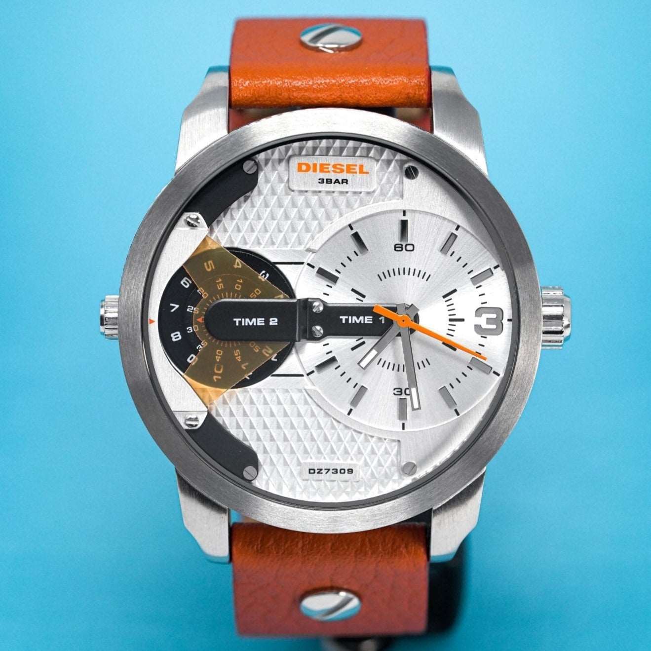 Diesel DZ7309: 57mm stainless steel case, black dial, dual time zone display, chronograph functionality, quartz movement, 30m water resistance. Bold and innovative design for any occasion. This striking timepiece exemplifies Diesel’s unique and modern style, making it a standout accessory for both casual and formal wear.