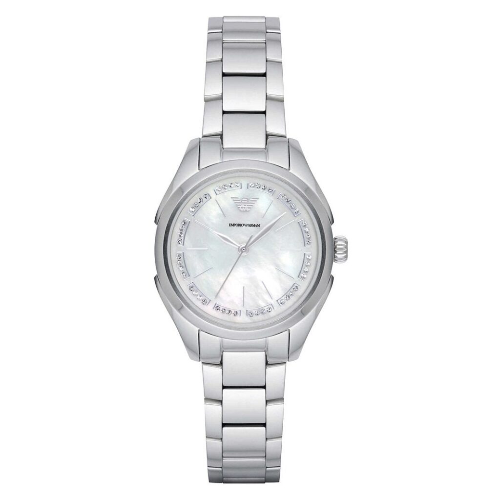 The timeless design gets a chic and modern update with this sleek Emporio Armani ladies to watch. Synonymous with quality, style, and sleek sophistication, Emporio Armani is well known for its modern take on timeless classics. This sophisticated design is fastened with a stainless steel bracelet and features a 32mm case with a polished bezel. The round face displays a pretty mother of pearl dial with silver-tone baton hour markers and hands and is finished with a glittering embellishment around the edge. Fusing a sporty lugs style with a touch of glamour, this watch will complement your look for every occasion. Quartz movement with analog display. Three-link bracelet with deployant clasp.