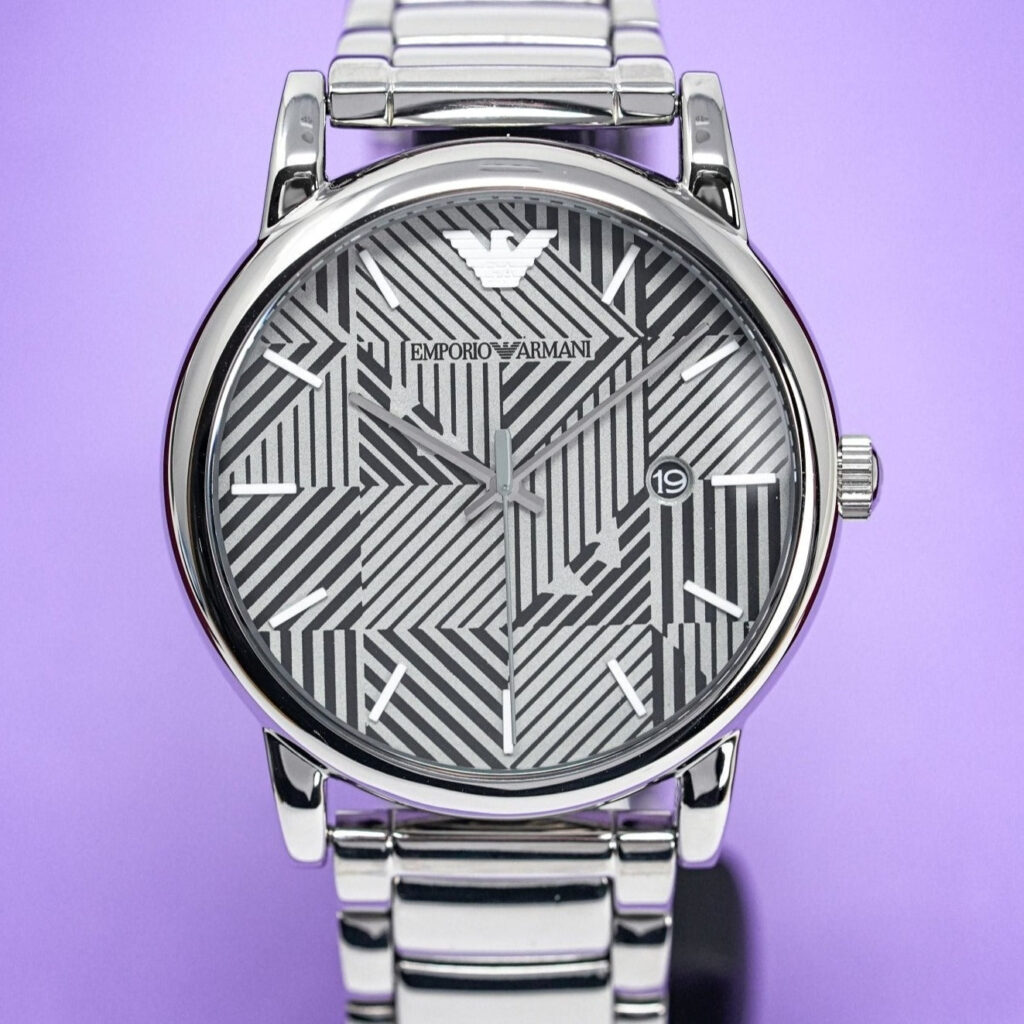 Black and White Textured Dial. Stainless Steel Hands and Indexes. Date Window at 3 O’Clock