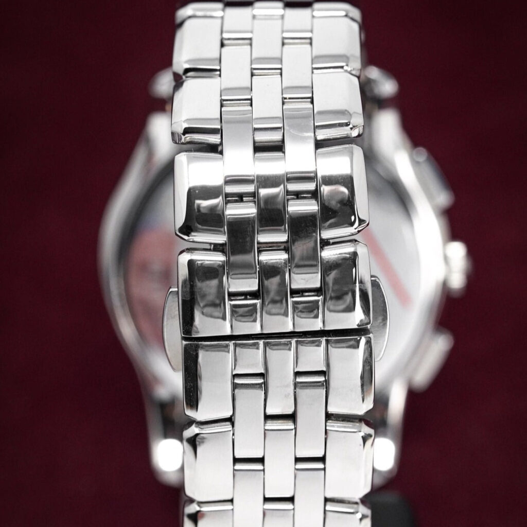 SIlver Guillochè Dial. Stainless Steel Hands. Silver Indexes. Date between 4 and 5 O’Clock.