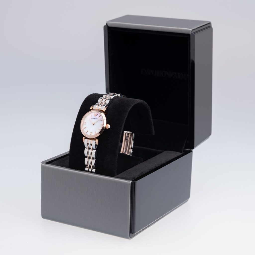 The Ladies Silver & Rose Gold Stainless Steel Emporio Armani Watch AR1764 is a fantastic ladies watch. This watch has a 22m stainless steel case with an analogue display. The watch has a mother of pearl dial with a stainless steel strap and is powered by Quartz movement. The watch is water resistant up to 30 meters and comes with a presentation box.