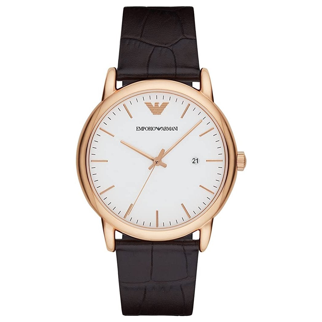 Smarten your accessories with this Emporio Armani watch. A sleek piece of modern horology, the watch features a clean large dial with slim hands, indices, a brand styling at 12 o’clock, and a date display at the 3 o’clock mark. White dial with rose gold-tone hands and index hour markers. The pared-down timekeeping features offer a definitive classic appeal. Rose gold-tone stainless steel case and a finished with a textured leather strap and a pin and buckle clasp.Â