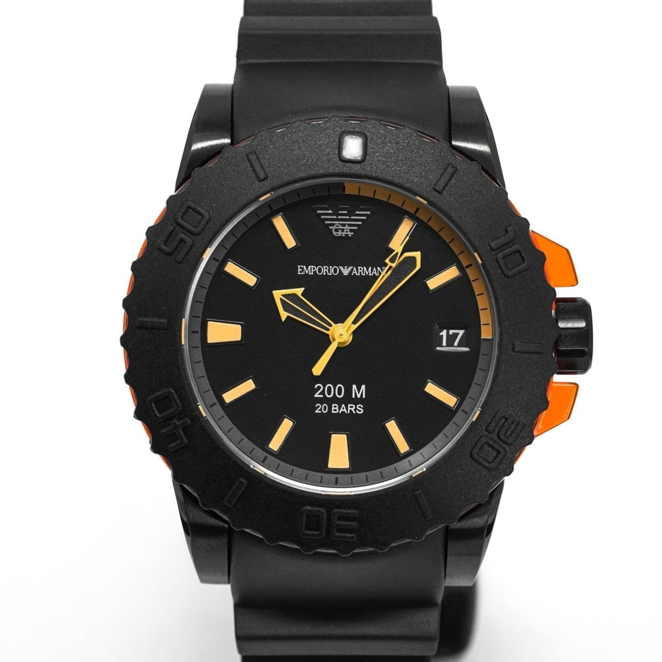Black Dial. Orange Stainless Steel Hands and Indexes. Date at 3 O’Clock.