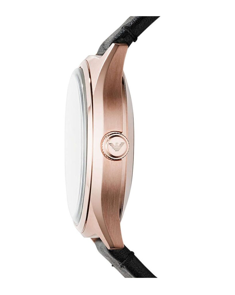 Give time to check a new definition with this stunning watch from Emporio Armani. Combining functionality with a smart style, this Emporio Armani watch is the go-to timepiece for daytime to evening wear and beyond. Its Stainless Steel case is sharp, bold, and artfully constructed. Its strap is conceptualized and crafted with the goal to make a statement. It features a stainless Steel With Shiny and Satin Finish, Pink Gold Color. Transparent Glass Watch And Black Dial. Made of Stainless Steel With Gold Shiny Gold Finish. Stylish Leather Strap With Black Lucent Finish.Â