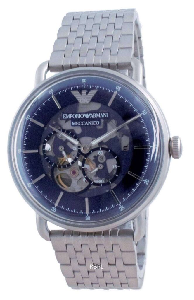 Explore the sophistication of mechanical precision with the Emporio Armani AR60024 Men’s Meccanico Watch. This exquisite timepiece is designed for the modern man who values both luxury and craftsmanship. Featuring a stunning blue skeleton dial that reveals the intricate inner workings, a polished stainless steel case, and a matching stainless steel bracelet, the AR60024 is perfect for any occasion, from formal events to casual outings.