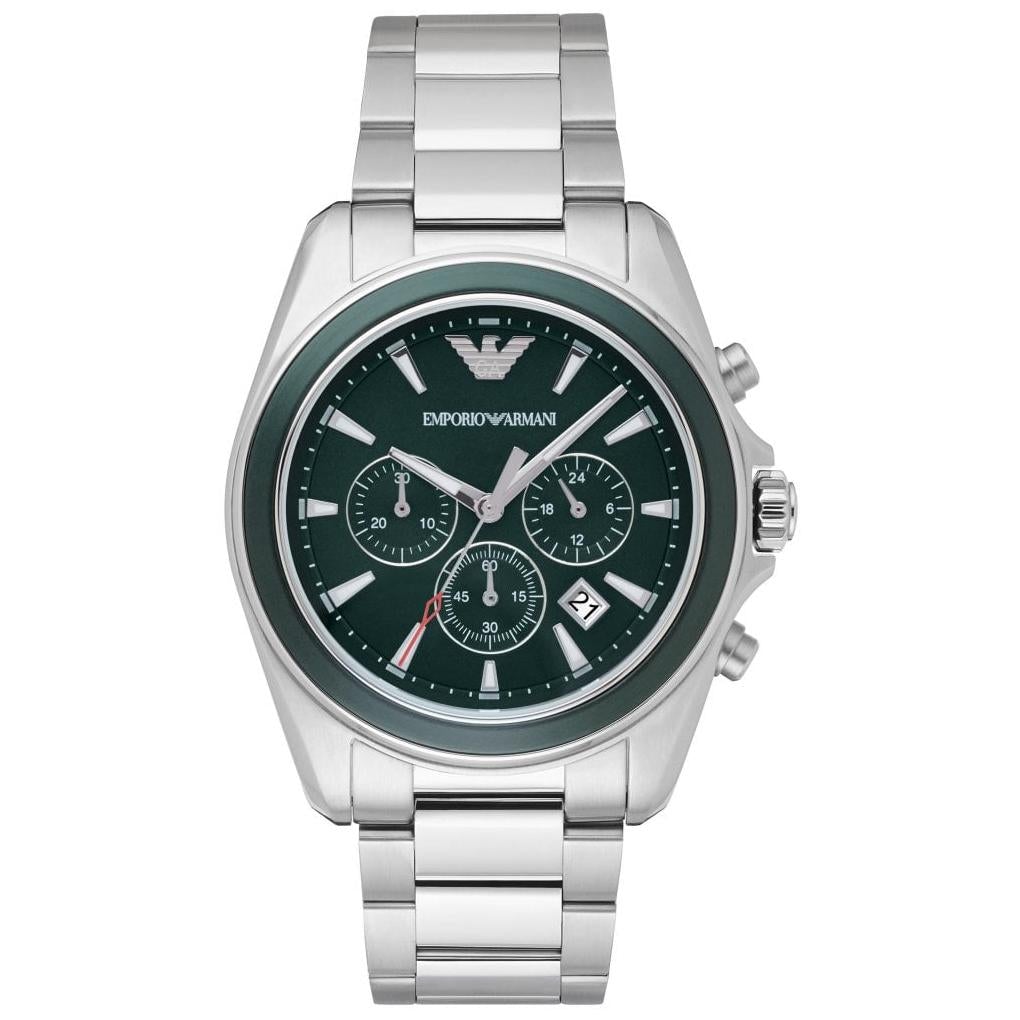 Make a standout style statement where ever you go with this stunning watch from Armani. It features a polished stainless steel bracelet strap, dark green dial with silver-tone hands, and index hour markers polished stainless steel with green bezel case and have a green with three hand movement, sub dial chronograph, and date window dial. Scratch-resistant mineral crystal.Â