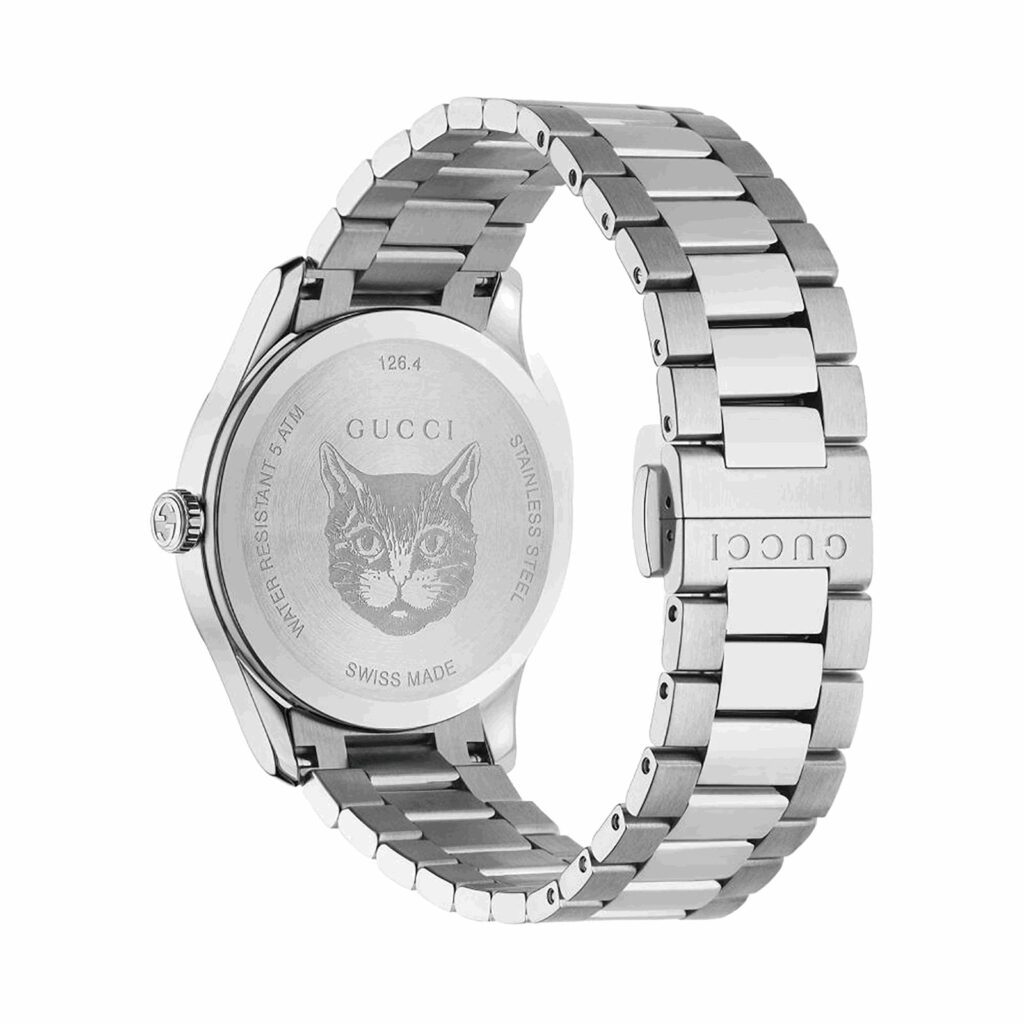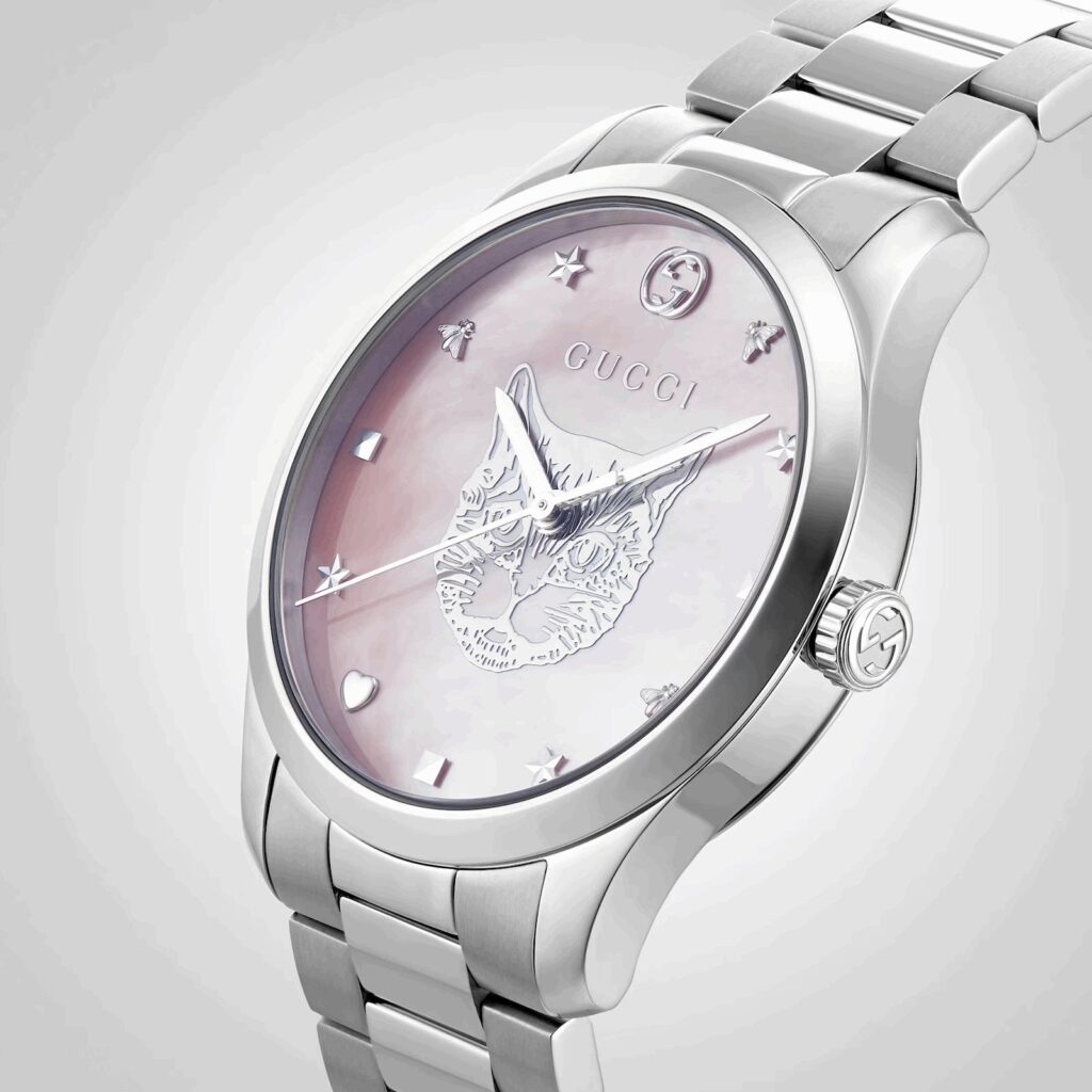 A new introduction for Epilogue collection, the G-Timeless watch is reimagined with the Mystic cat set against a pink mother of pearl dial. The feline is highlighted by silver-toned indexes that take the form of the Gucci bee, hearts and stars—distinctive codes of the House. The steel case continues into a bracelet that wraps around the wrist. Steel case and bracelet, pink mother of pearl dial with multi icon indexes and feline head Sapphire glass with antireflective coating The warranty certificates for Gucci watches purchased after March 1st 2022 are exclusively available online. Download your certificate at https://watchwarranty.gucci.com by using the serial number engraved on the back of your watch. 5 ATM (160 feet/50 meters) Quartz movement Wrist size from 133mm to 195mm YA1264166 Swiss Made