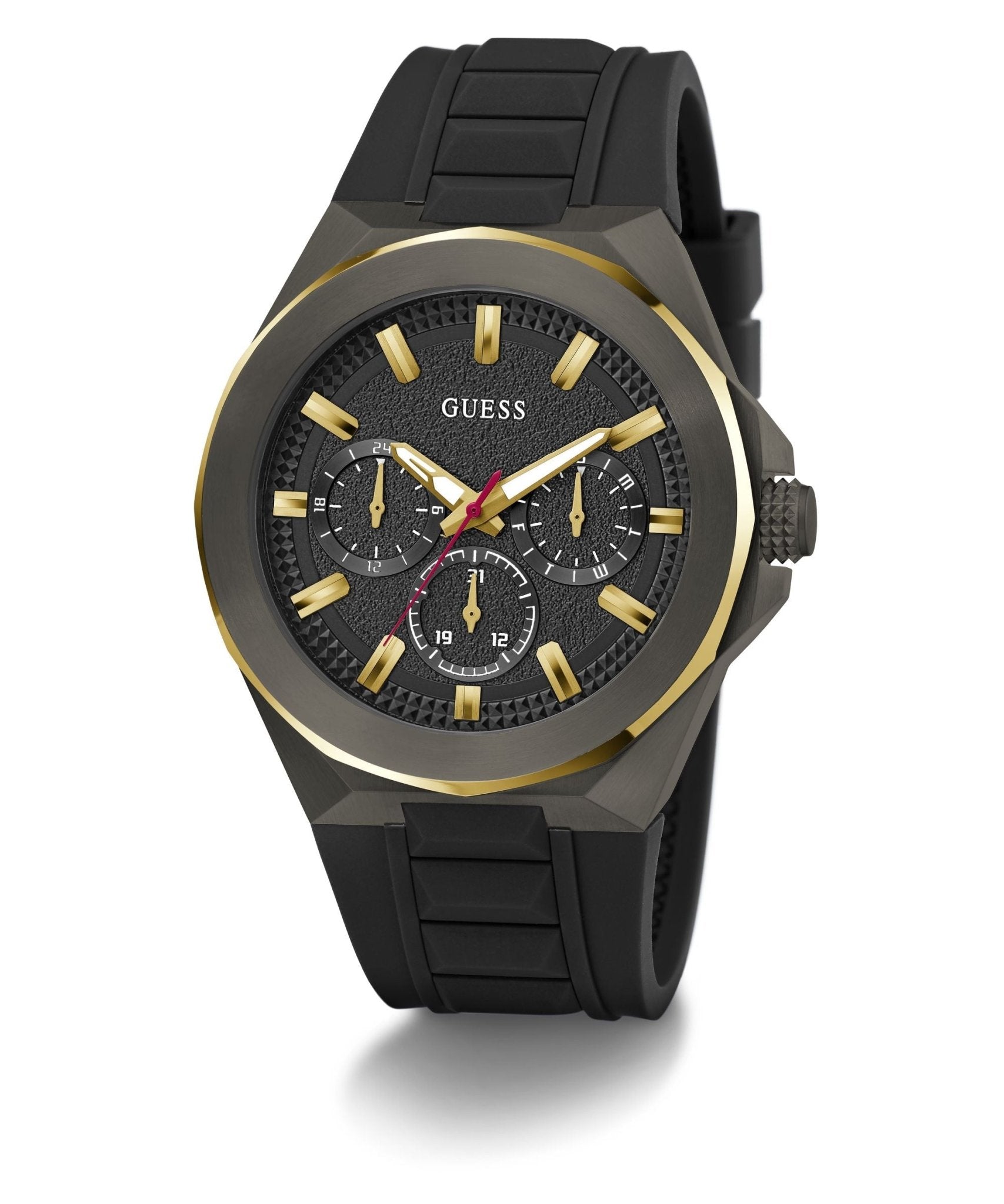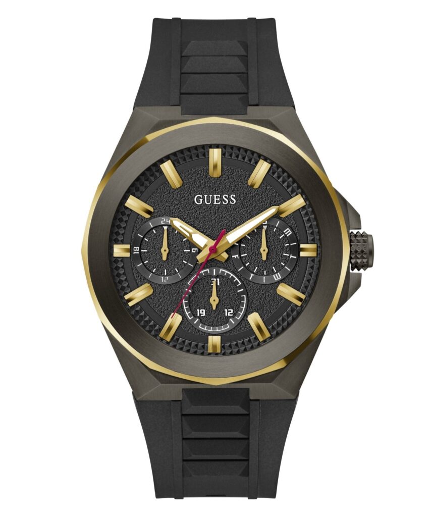 Featuring a robust 46 mm round case made from recycled steel, this timepiece is durable and eco-friendly. The striking sunray black dial not only enhances readability but highlights the intricate design and craftsmanship that goes into every Guess product. With a case thickness of just 10.3 mm, it sits comfortably on the wrist, making it ideal for daily wear.