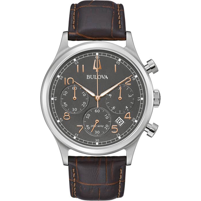 Fusing style with precision, this Precisionist Chronograph timepiece from Bulova features our proprietary 262kHz quartz movement. This 6 hand chronograph is styled with a brown leather strap, stainless steel case and grey-tone dial with rose-gold tone accents for a timeless look that will never go out of style.