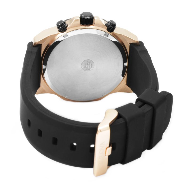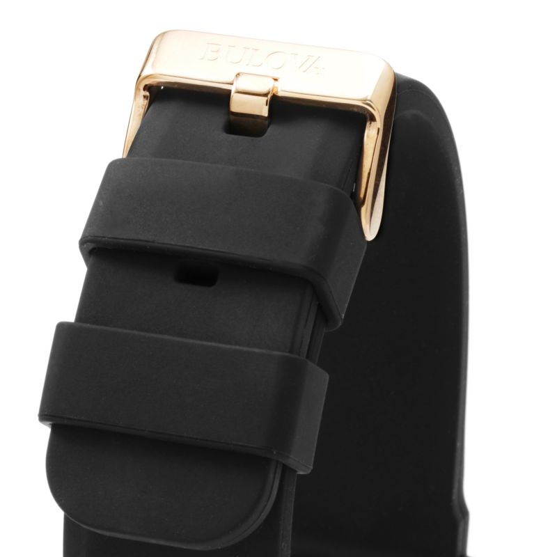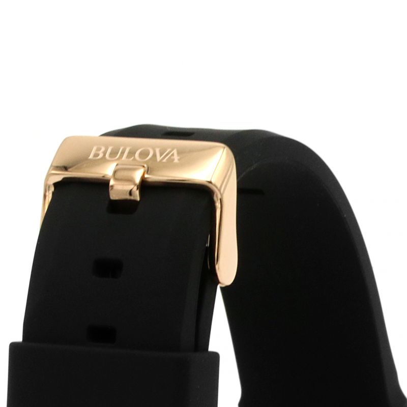 Stylish mens Bulova Marine Star watch made with a large PVD rose plated 44mm case. This eye-catching chunky design has a round black dial with rose Roman numeral hour markers and chunky high-visibility hands. Features include date function, 100m water resistant and chronograph function. It fastens with a quality black rubber strap and powered by a quartz movement.
