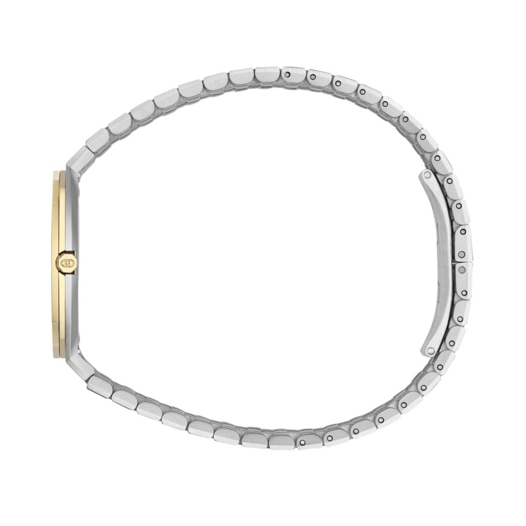 - Golden brass dial with interlocking G motifs and 18ct yellow gold plated stainless steel hands