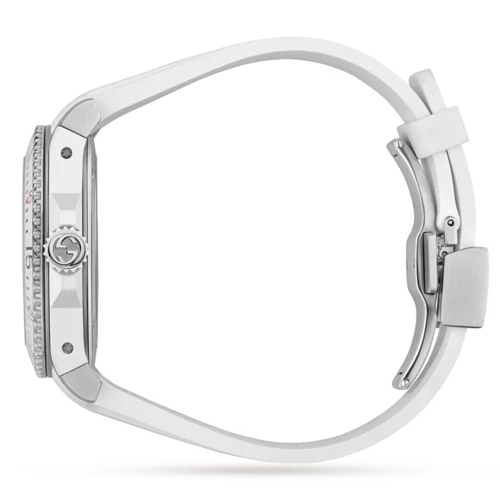 In a silhouette that mirrors the recognizable details of a diver’s watch, the Gucci Dive has a contemporary appeal with a silver colour dial and white rubber strap. Steel case, white bezel, white rubber sides and crown, silver colour dial with multi icon indexes, white rubber strap Sapphire glass with antireflective coating The warranty certificates for Gucci watches purchased after March 1st 2022 are exclusively available online. Download your certificate at https://watchwarranty.gucci.com by using the serial number engraved on the back of your watch. 20 ATM (660 feet/200 metres) Quartz movement Wrist size: 150mm to 195mm YA136337 Swiss Made
