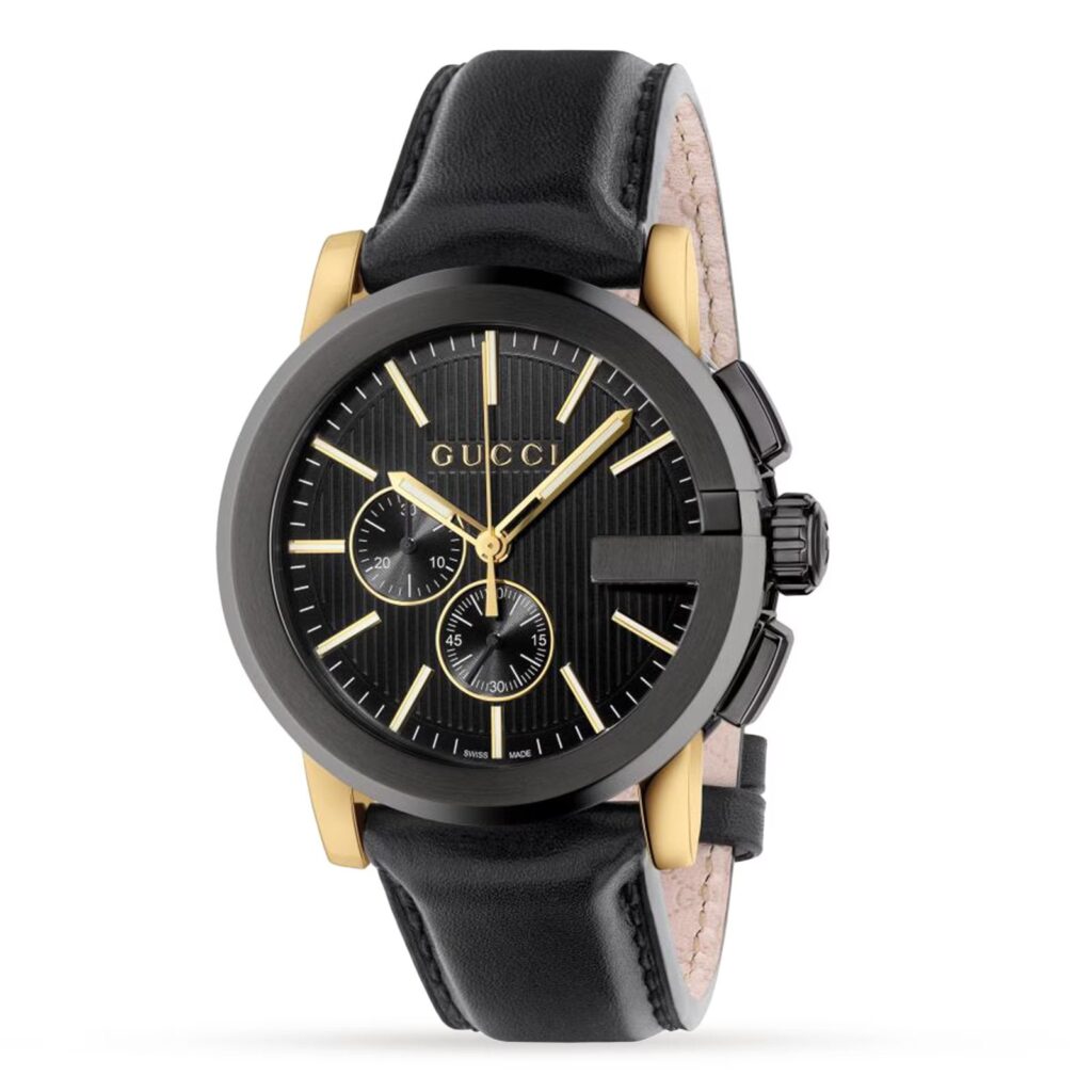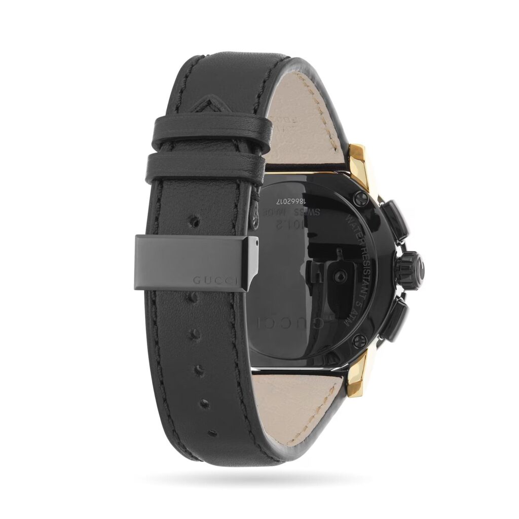 Steeped in elegance, the G-Chrono watch from Gucci stands out with its unique G-shaped bezel, reflecting the brand’s signature charm. It boasts a sophisticated blend of black guilloché dial with a light yellow gold PVD case and a comfortable black leather strap, symbolizing a perfect fusion of contemporary design and sporty allure. Each timepiece is accompanied by an exclusive online warranty certificate, downloadable from watchwarranty.gucci.com. With its precision Quartz movement and superior Swiss craftsmanship, this watch is a testament to style and functionality.